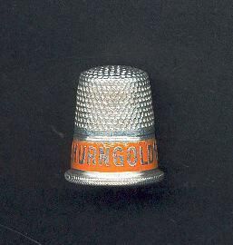 Aluminum Advertising thimble with yellow-orange coloured band. Rolled rim with diagonal lines. Advertising Ò*Churngold Ohio Butterine Co. Cincinnatti OhioÓ No marks.