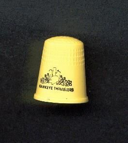 Yellow coloured plastic Advertising thimble. Black printing on band. Picture in black, small, of pig, corn, fruit, buildings with ÒHawkeye Thimblers Ò in black below. U.S.A 4 stamped in apex.