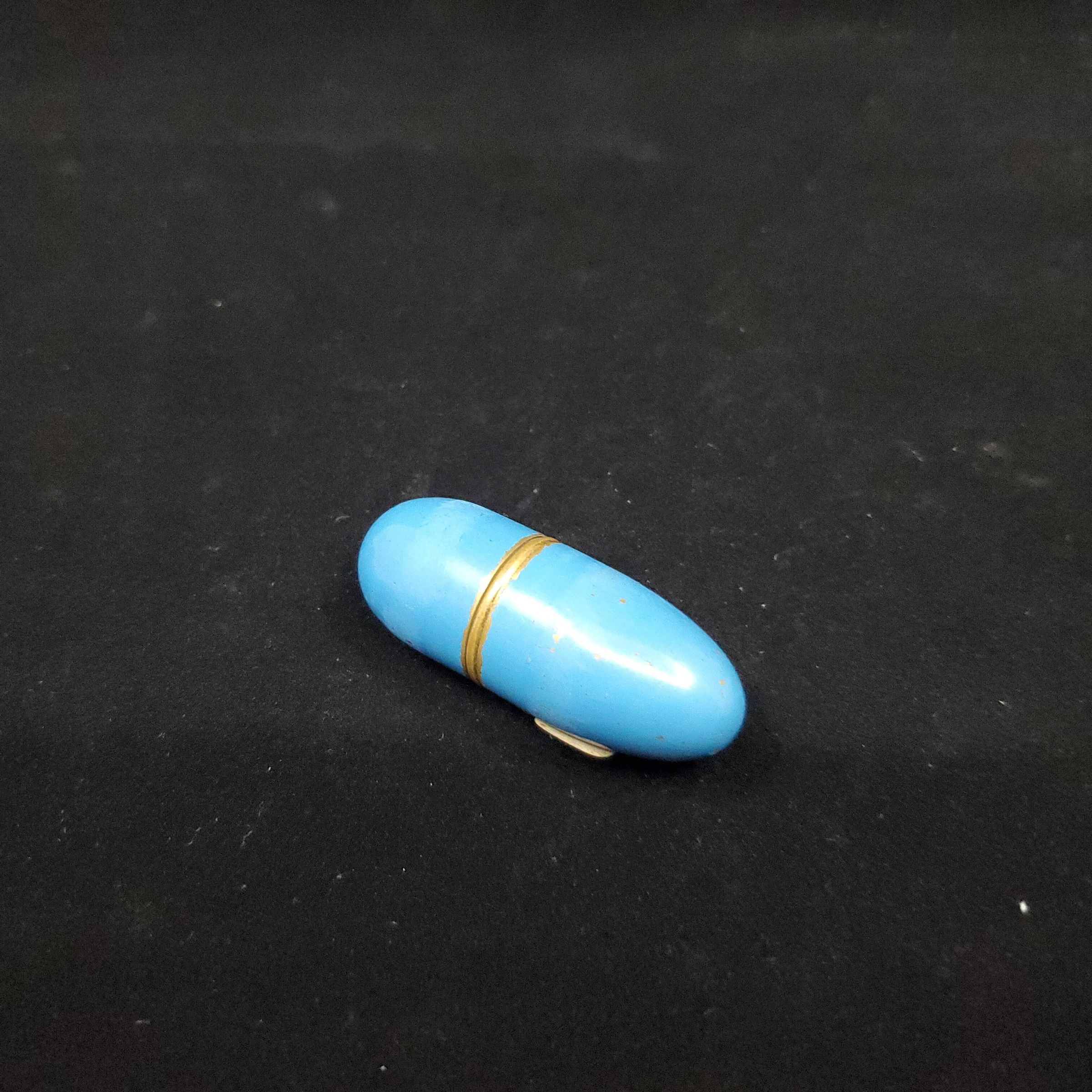 Blue enamelled brass bullet shaped case with a wooden 2 thread spindle brass topped for needles or pins. Thimble also in case 3 tiered brass thimble with rolled rim. Wide plain band above, narrow raised band, narrow plain band then knurling in 3 sections with a plain band betwen to top. Top knurled. No marks.