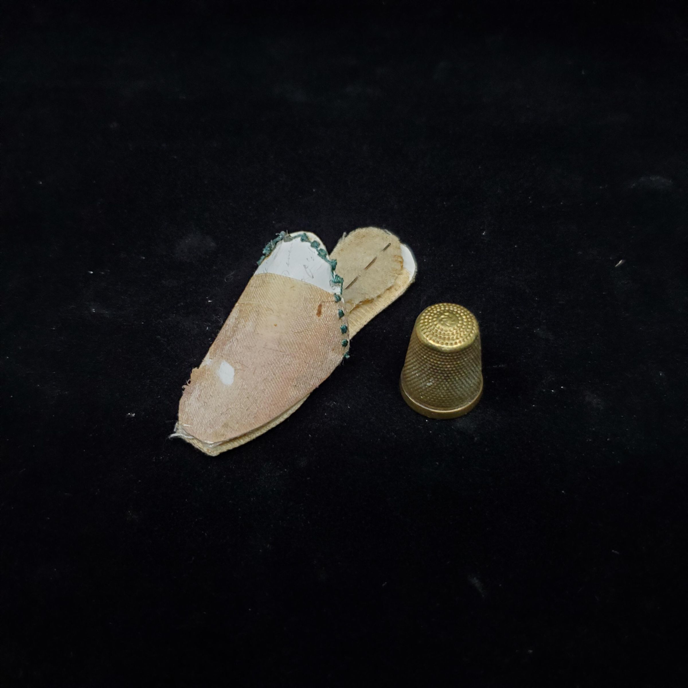 Satin ,beige pink coloured thimble holder and needlecase in shape of slipper.Pins inserted around flat heel. Gilded bodkin held by thread bars along sole.,Green decorative french knots aroiund top of slipper. One flannel insole with needle. No thimble as purchased. Brass thimble, old, added. Narrow plain band at rim with 33 stamped on it. Knurling from band to and over top.
