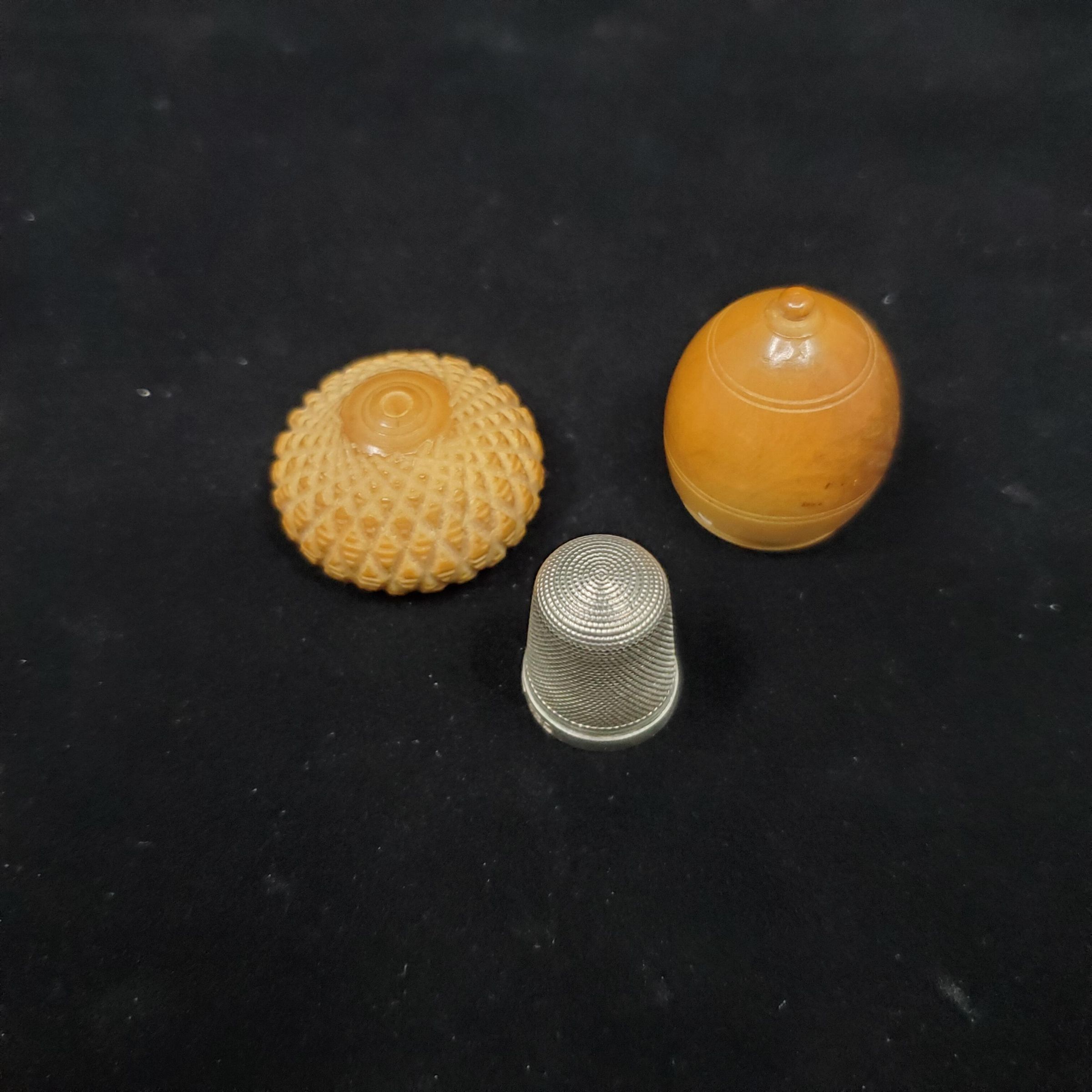 Vegetable ivory case in shape of acorn. Very realistic.To- of case has diamond shaped markings. Thimble inside. Plain silver thimble with narrow band at rim. with English hallmarks. Marked - Birmingham 1911 HG&S 9 maker Henry Griffiths & Son and 17 (size). Knmurling from band to and over top.