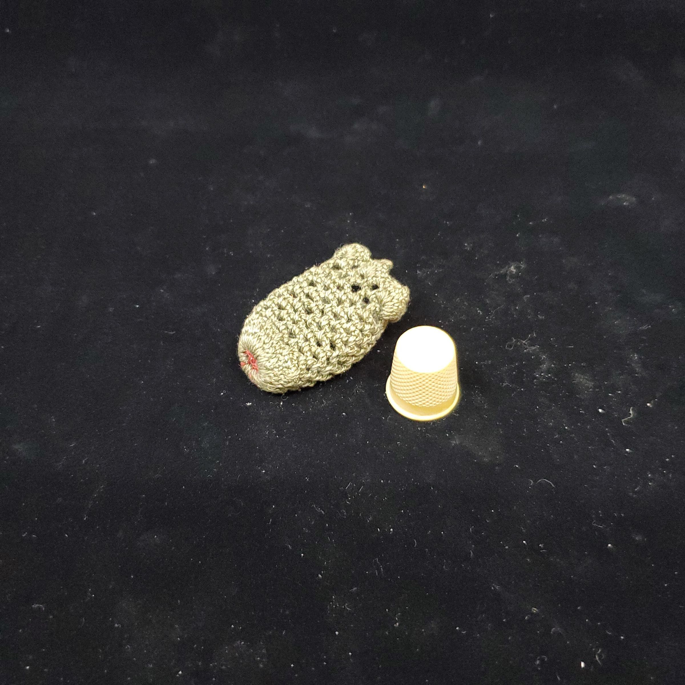 Green crocheted thimble holder, scalloped edges, red thread at base used to close start of ctochet. Contains thmble. Early plastic ivory coloured thimble. Inside of thimble shows cracking and some discolouration.Rolled rim, wide plain band above then knurling to and over top No marks