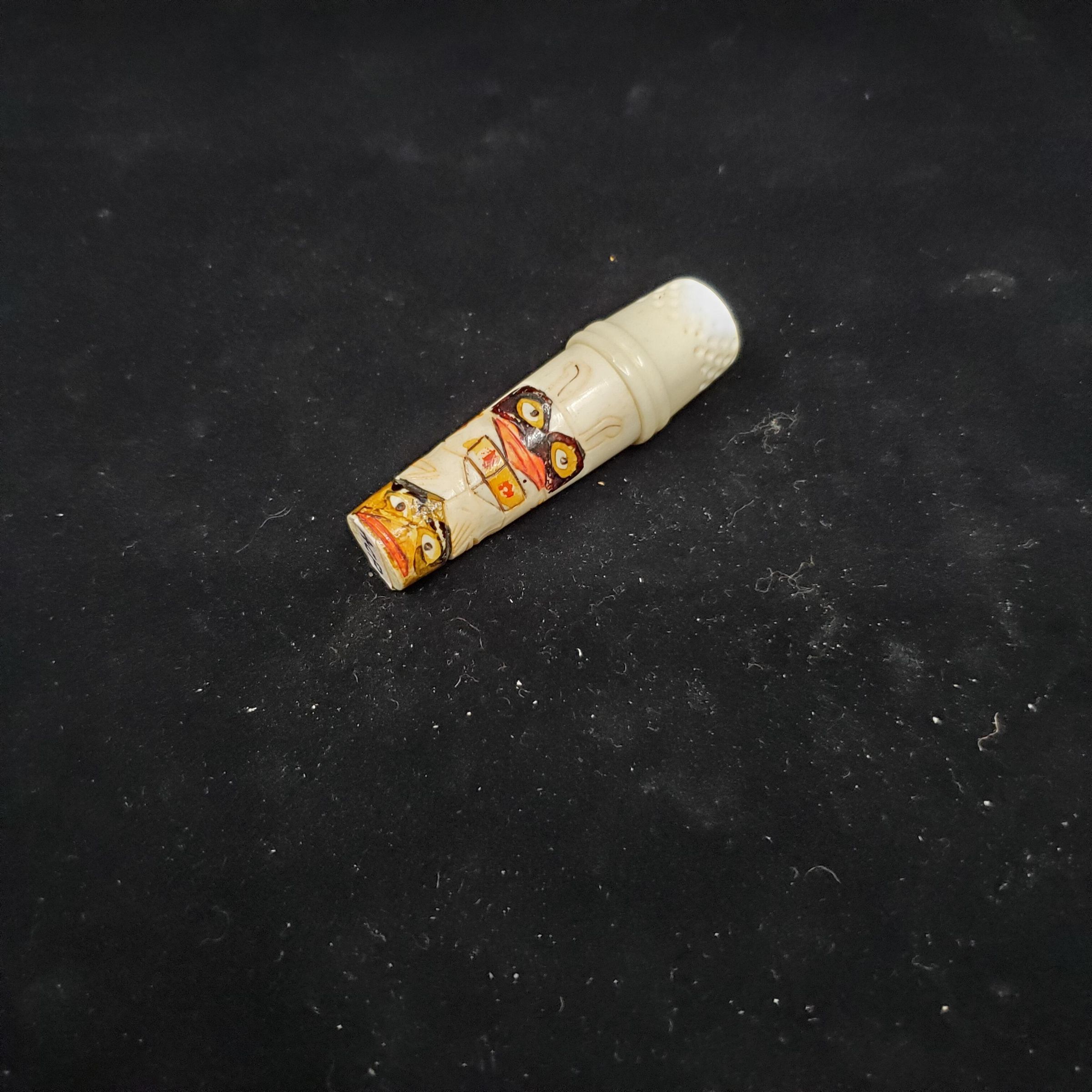 Bone sewing kt with carved totem pole design, Thimble is top of kit. 3 thread bobbin with top for needle case part.. Creamy white in colour. Totem colours mainly red and black. Creamy white thimble top of case. 2 rounded bands at rim. Wide plain band above then knurling to and over top. Flat top. Inside screw lines for holding onto kit.
