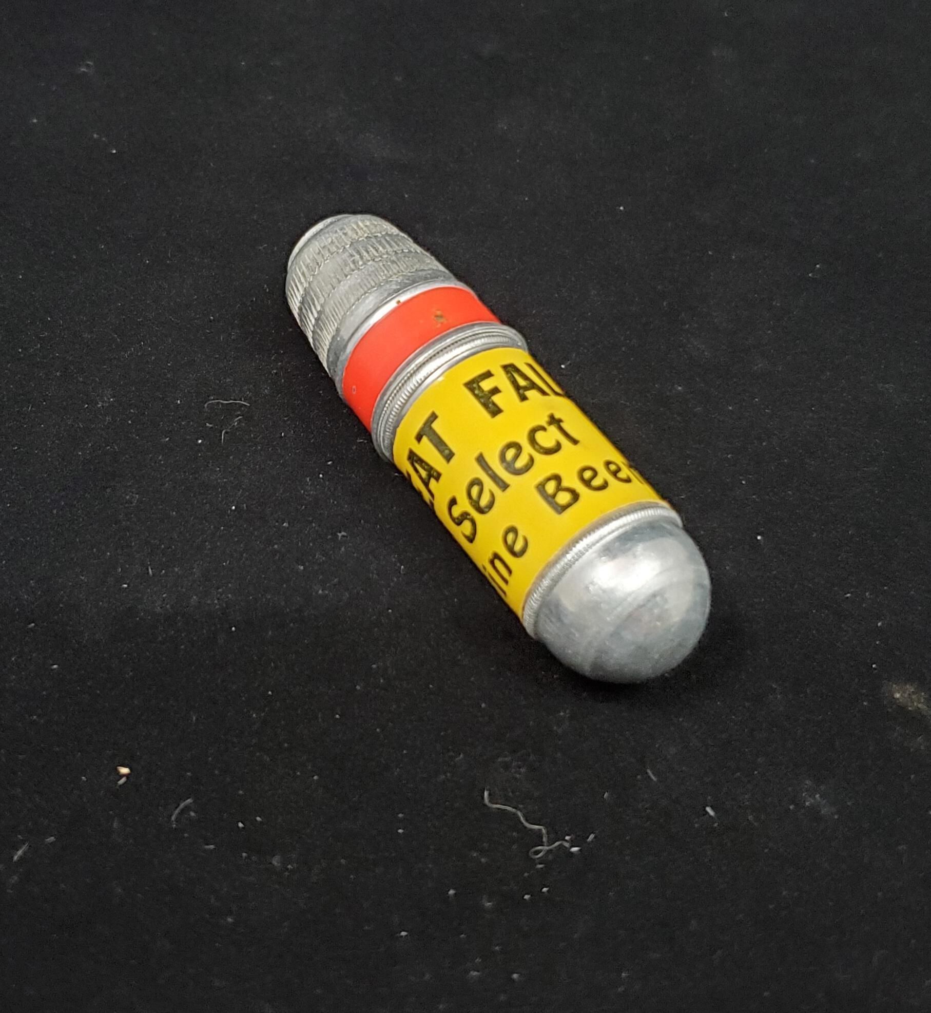 Metal - aluminum - needle case with thimble top. Silver coloured case with red band at opening. Yellow advertising on lower part of case Black printing advertising ÒGreat Falls Select Fine BeerÓ. Case empty. Thimble is top of case. Silver colured with narrow raised rim. Wide plain painted red band above. 3 rows of vertical knurling to top and round knurling on top.