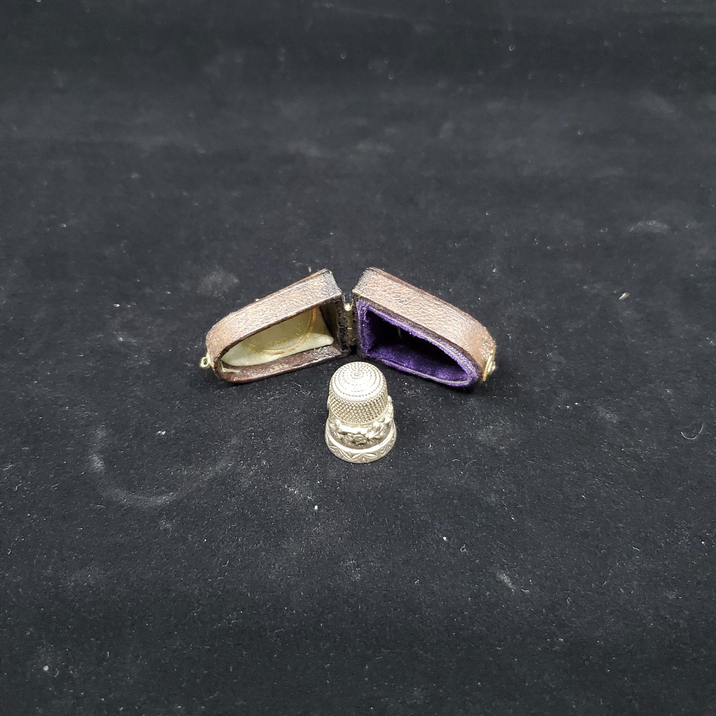 Leather thimble shaped case,brown with brass fittings. Inside purple velvet in bottom, white satin in top with logo of ÒDavidson Bros. New Westminster, Vancouver, VictoriaÓ Silver thimble with wide decorated band at rim. Very wide band of pattern above - raised flowers, stems and leaves with shield shaped cartouche.Knurling to and over top. Nothing on cartouche. Size - 8 - marked on rim band. No other marks.
