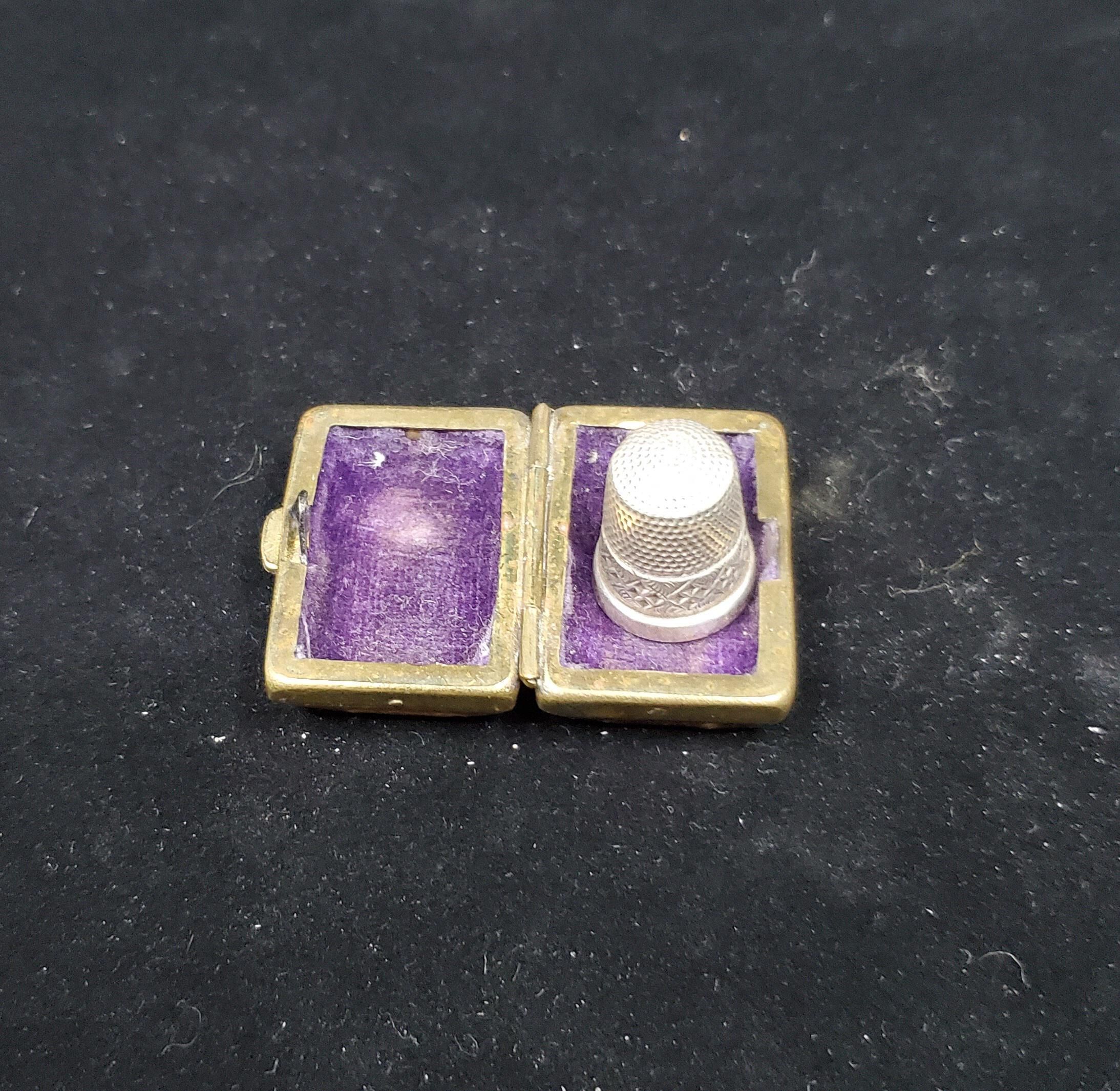 Leather , brown, suitcase type thimble case. Brass fittings.Maroon velvet lining in case. Silver thimble with English hallmarks. Narrow band at rim with size -9 -, Birmingham and 1898. Wide band of pattern - diamonds within diamonds on a curved linear background. Knurling from band to and over top.