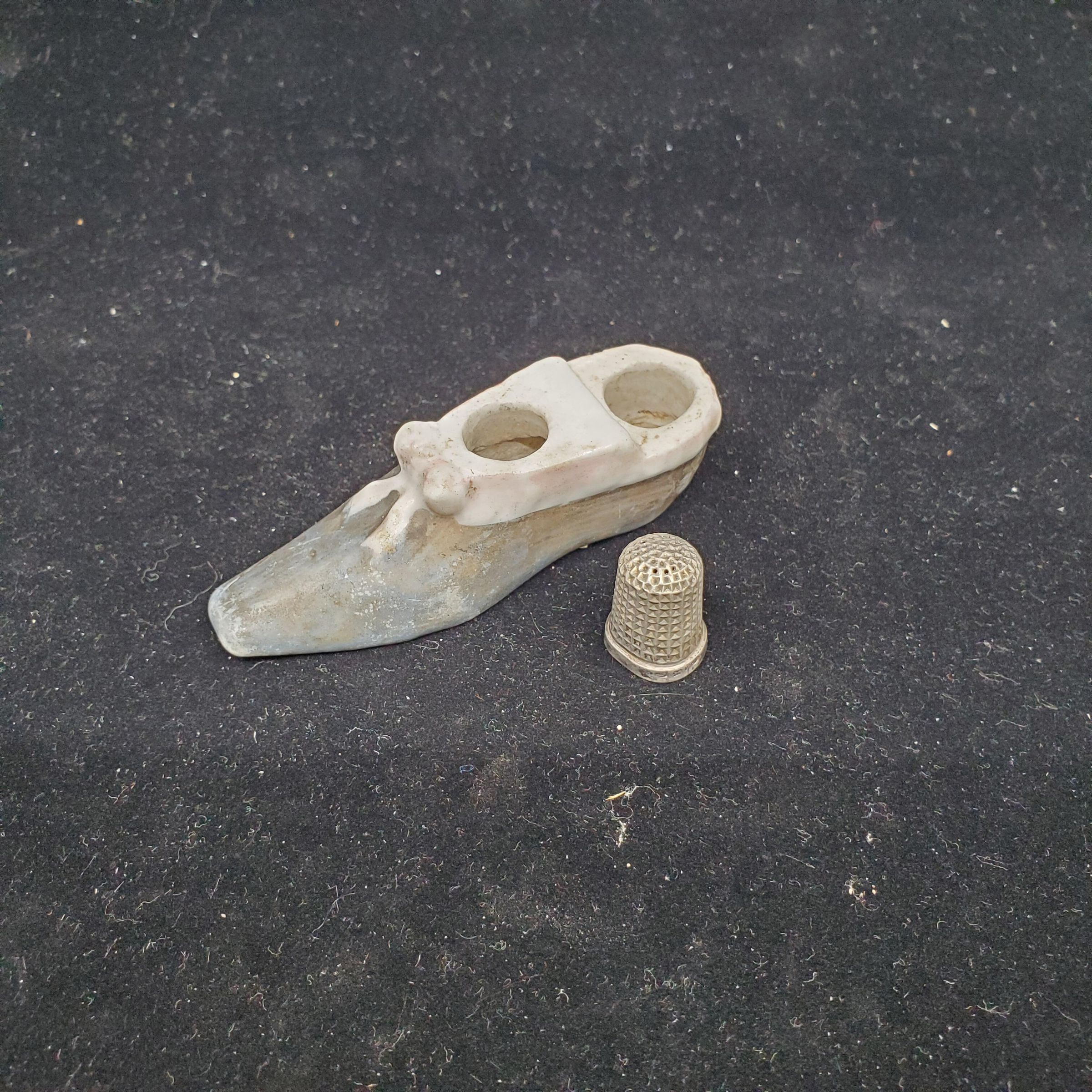 Stone thimble holder in shape of shoe. Lower part in tones of grey, top around opening in white,bow at front white. 2 holes for thimbles, only 1 thimble as purchased. Silver thimble,out of round with plain raised band at rim. English hallmarks on band but the only one I can read is the Birmingham one. Waffle pattern from band to and over top.