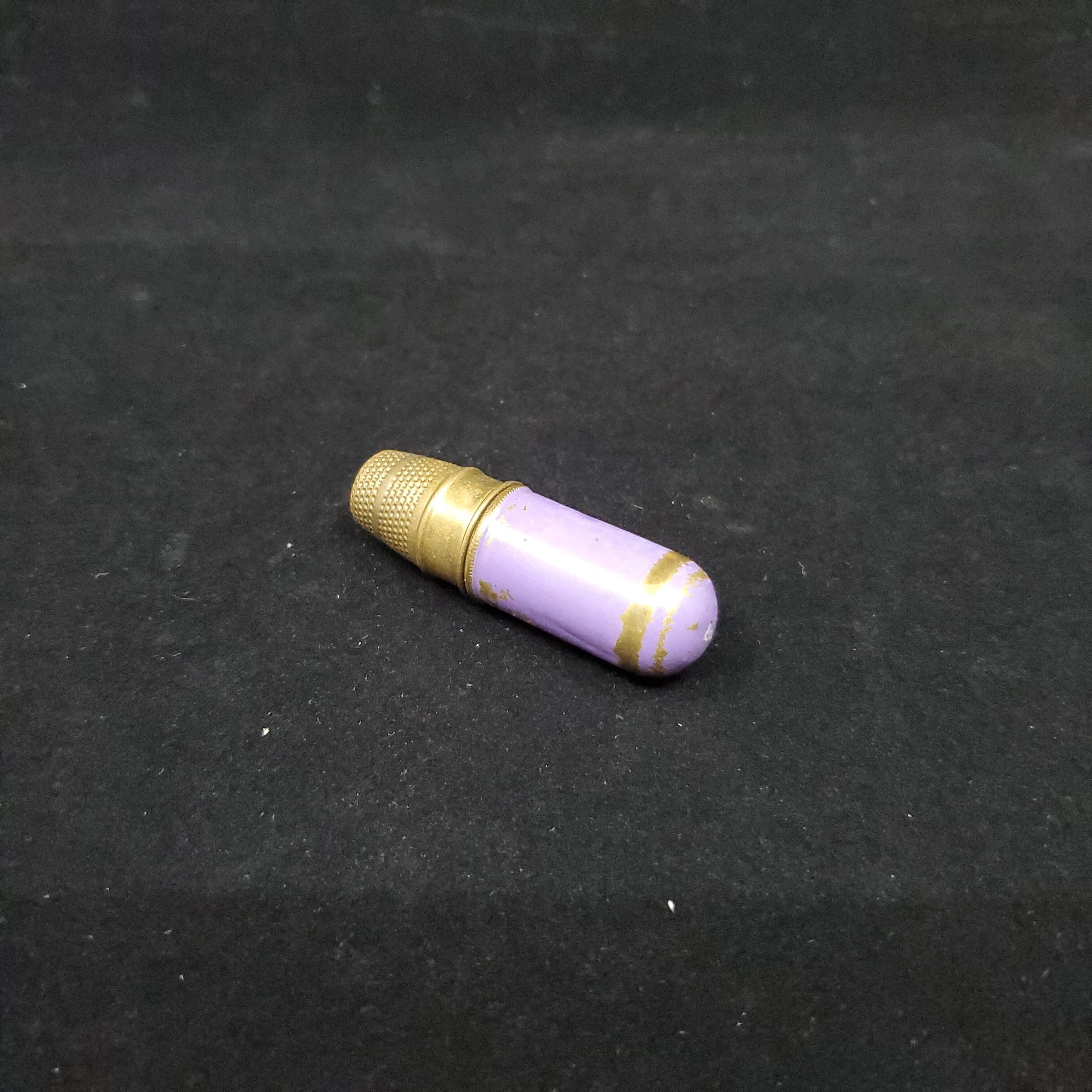 Bullet shaped purple thimble case with brass thimble for top end.Case and thimble are brass. Inside 2 thread metal (nickel?) bobbin with holder for needles and top. ÒMade in GermanyÓ on top part of lower case. Brass thimble with rolled rim.Wide plain band above, then 2 bands of knurling with a plain band between to top. Flat knurled top. Pushes on to lower part of case.
