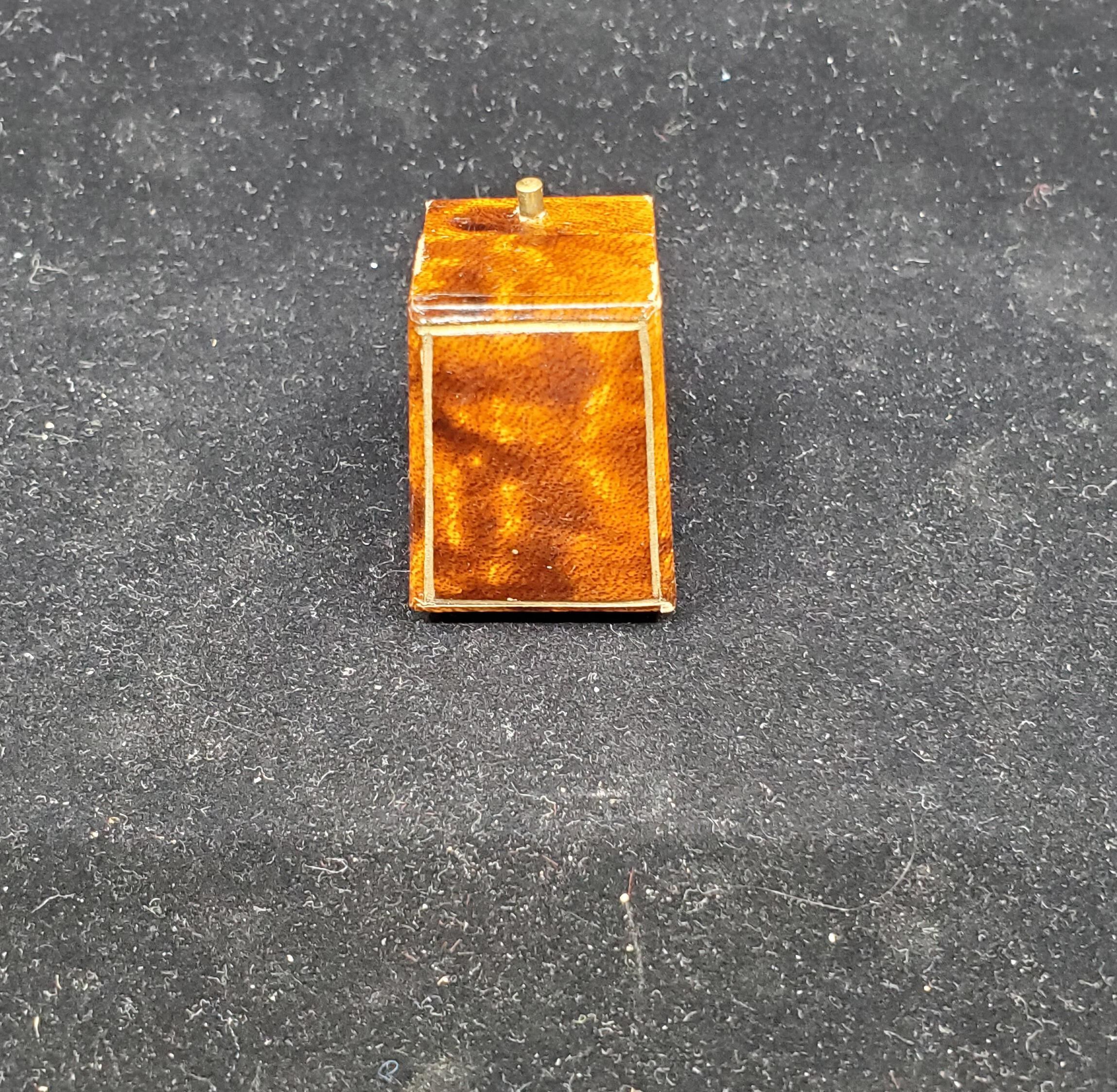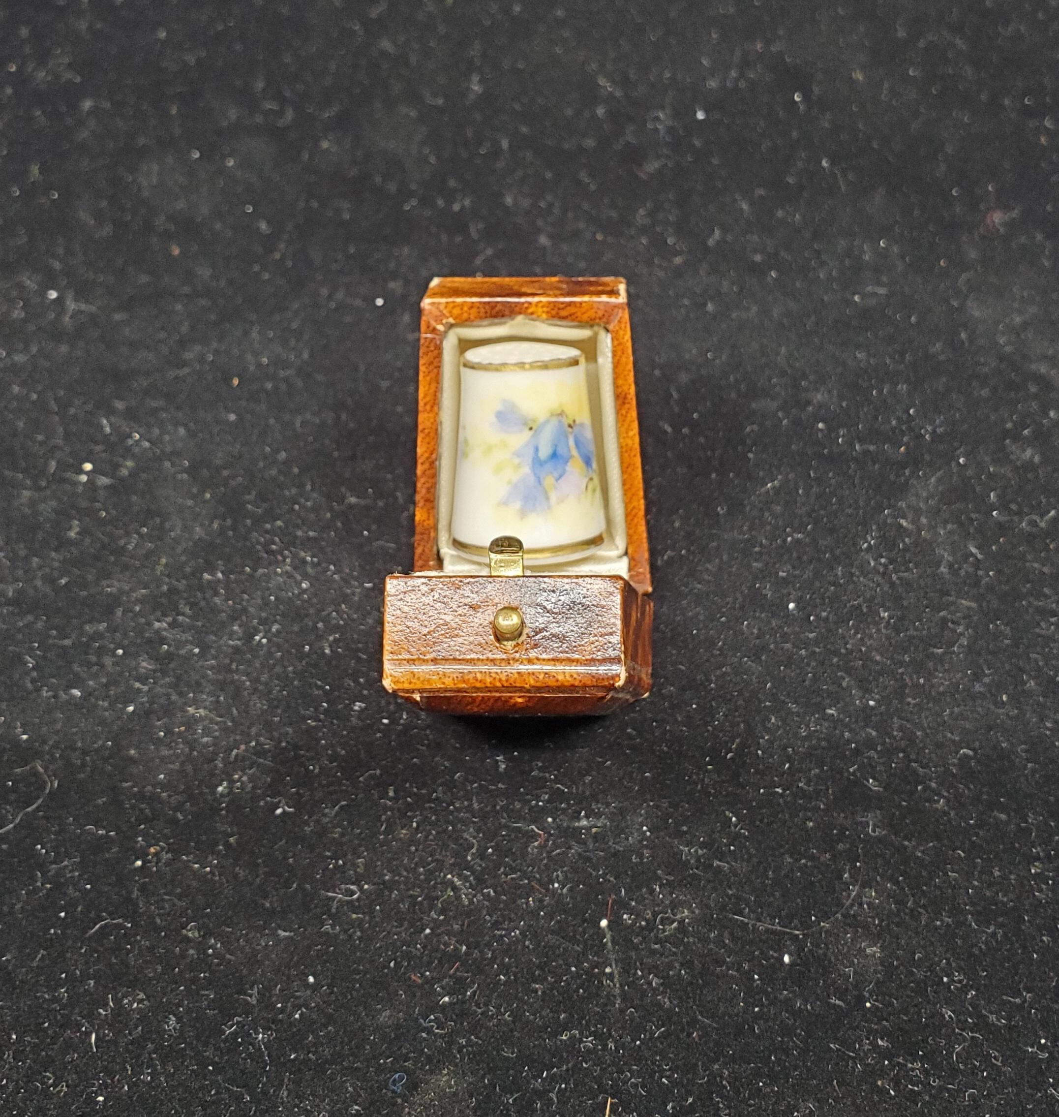 Brown mottled leather case outlined in gold. Lined inside in cream coloured satin. on top and white velvetin bottom.Brass fittings. Thimble included. Royal Worcester purple mark thimble with painting by William Powell. Probably Parian Ware. Hand painted branch with blue harebells (thimbleflowers). Gold band top and rim Signed Powell Flat top with indentations.