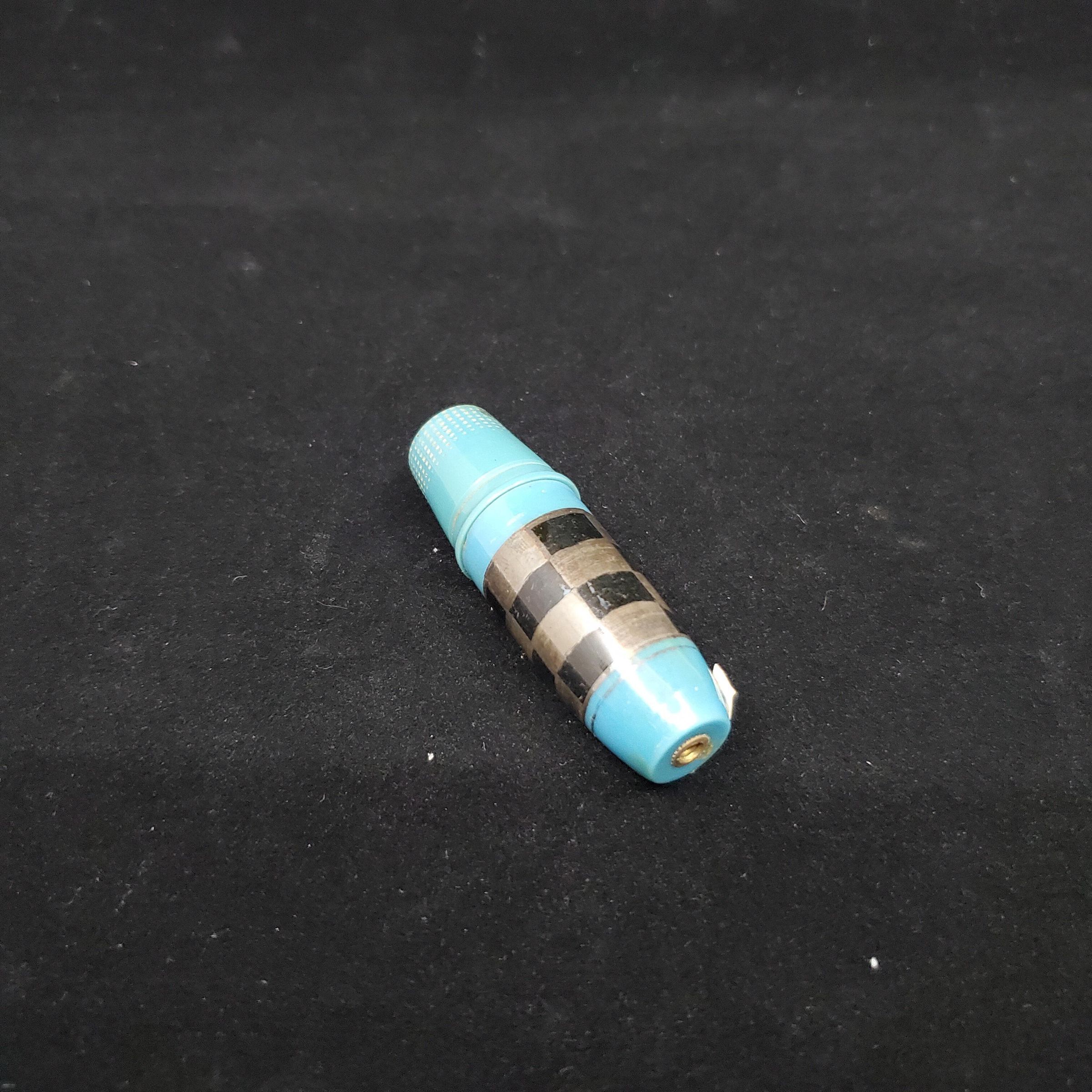 Bullet type sewing kit. Blue with black and silver design.Thimble is top of case. Inside cream coloured plastic thread bobbin,one end removeable for needles. Small scissors in case. Bottom of case, outside has metal screw-in for scissors - acts as handle. Thimble, blue colour, slightly fluted with screw lines inside to attach to lower part of case.Narrow plain band then an indented line then a wide plain band.Few rows of knurling to top. Flat top with circular lines as knurling.