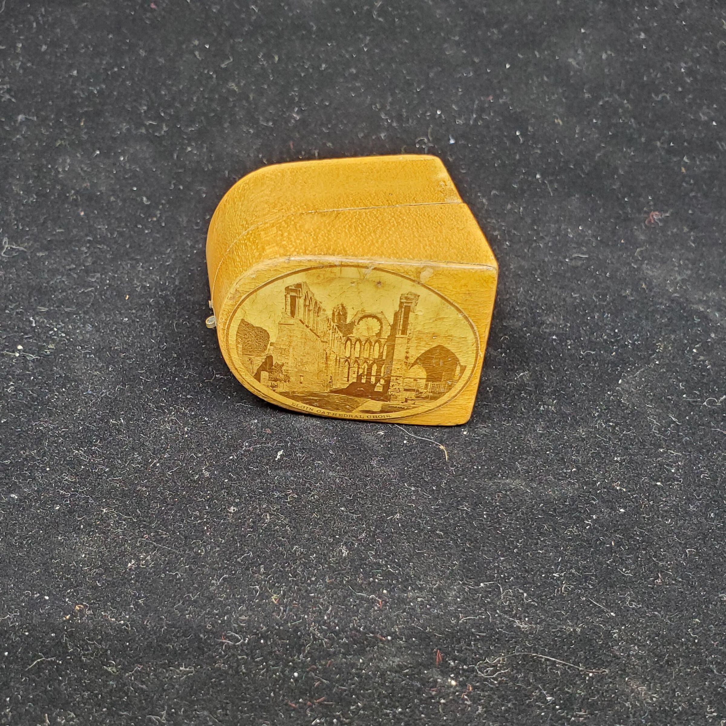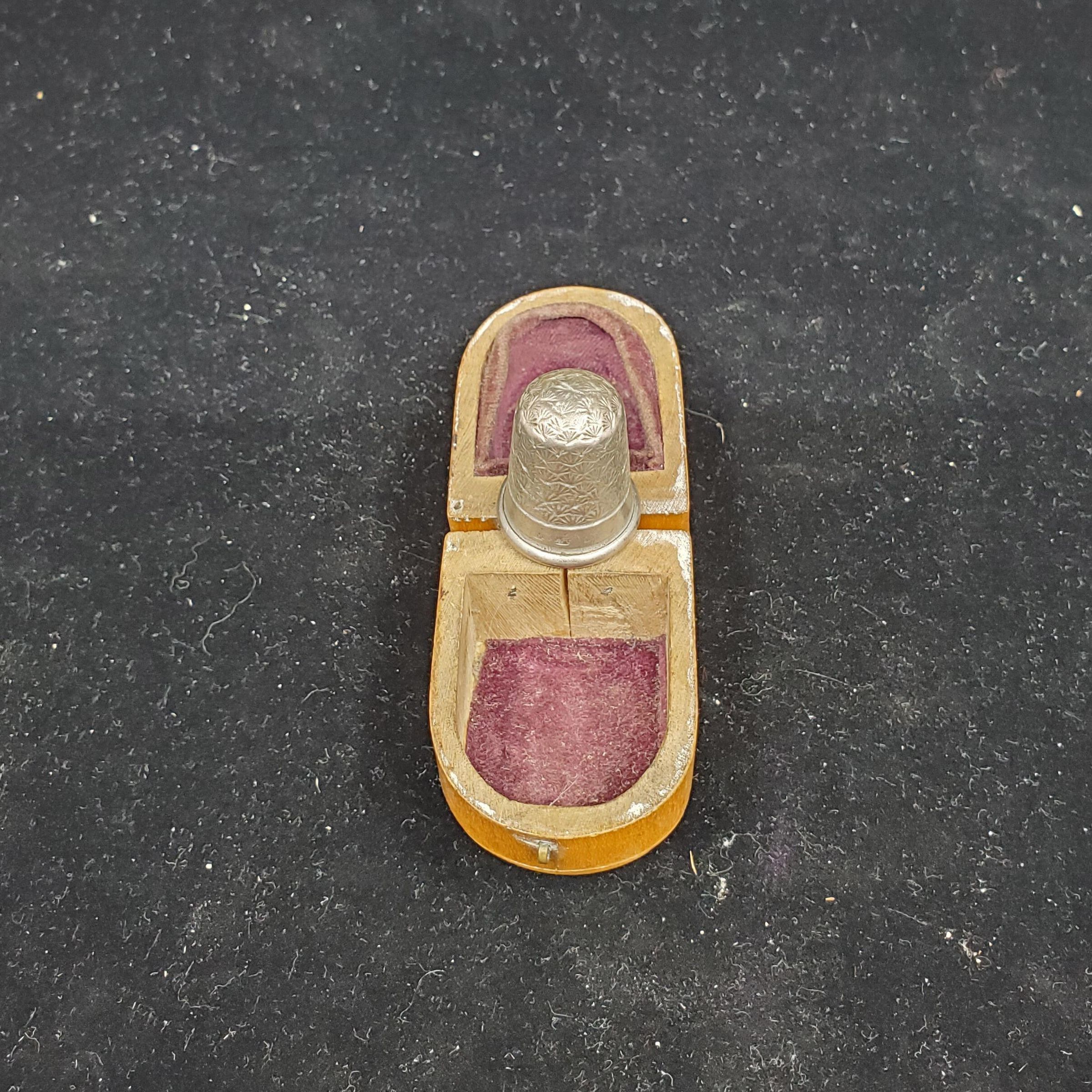 Wooden transfer ware thimble case with thimble. Oval print of ÒElgin Cathedral ChoirÓ on top of case. Front brass closure missing. Brass fitting on back. Mauchline Ware. Brown velvet i inside of case. Tall silver thimble with rolled rim.Narow band above rim with worn English hallmarks.Fan pattern above band to and over top.