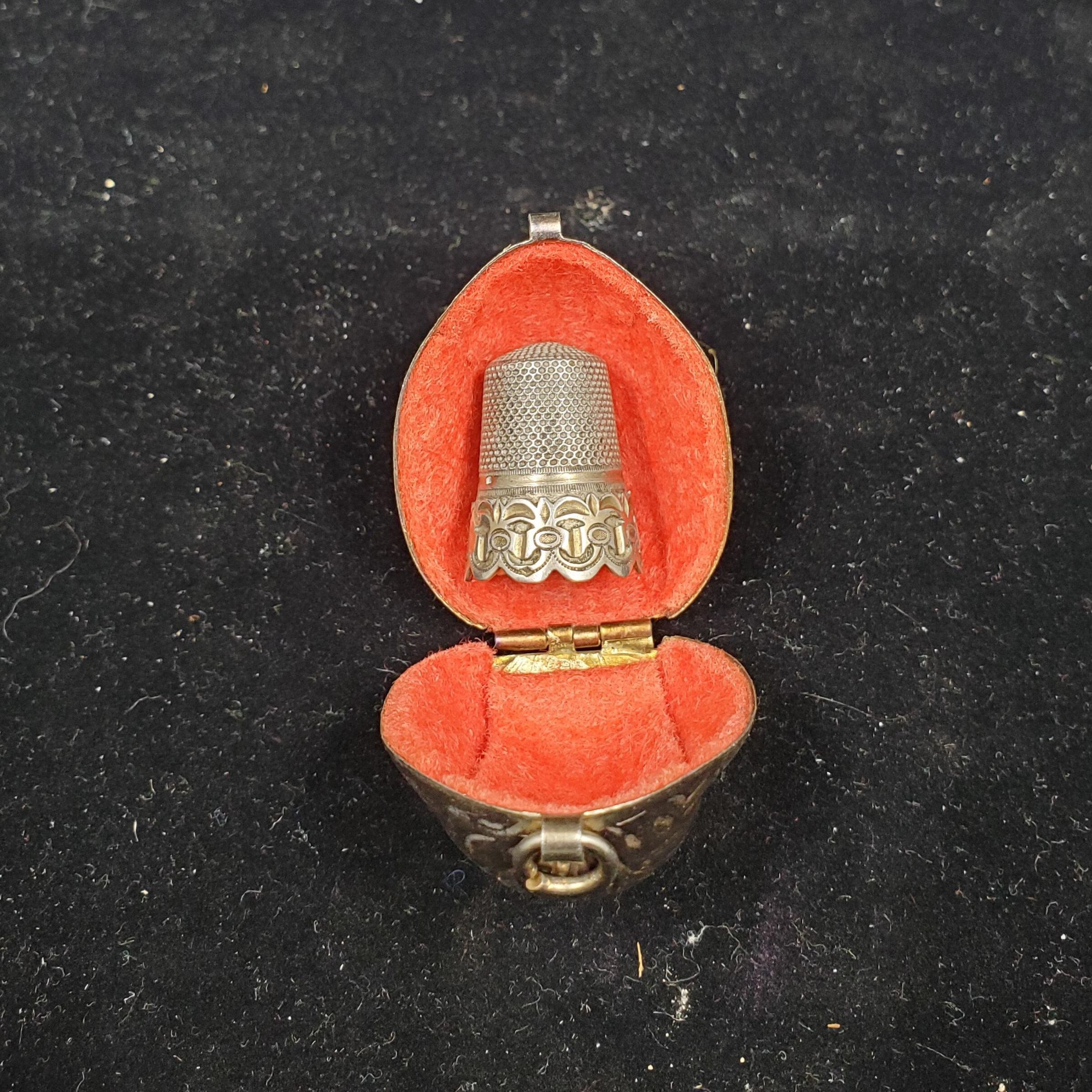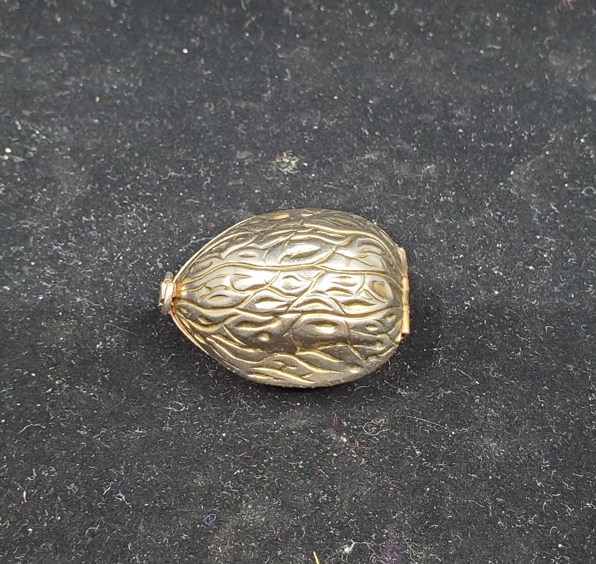 Brass coloured metal thimble case,in shape of walnut. Lined in red felt with cut-out for thimble. Metal overlap closure. No thimble.