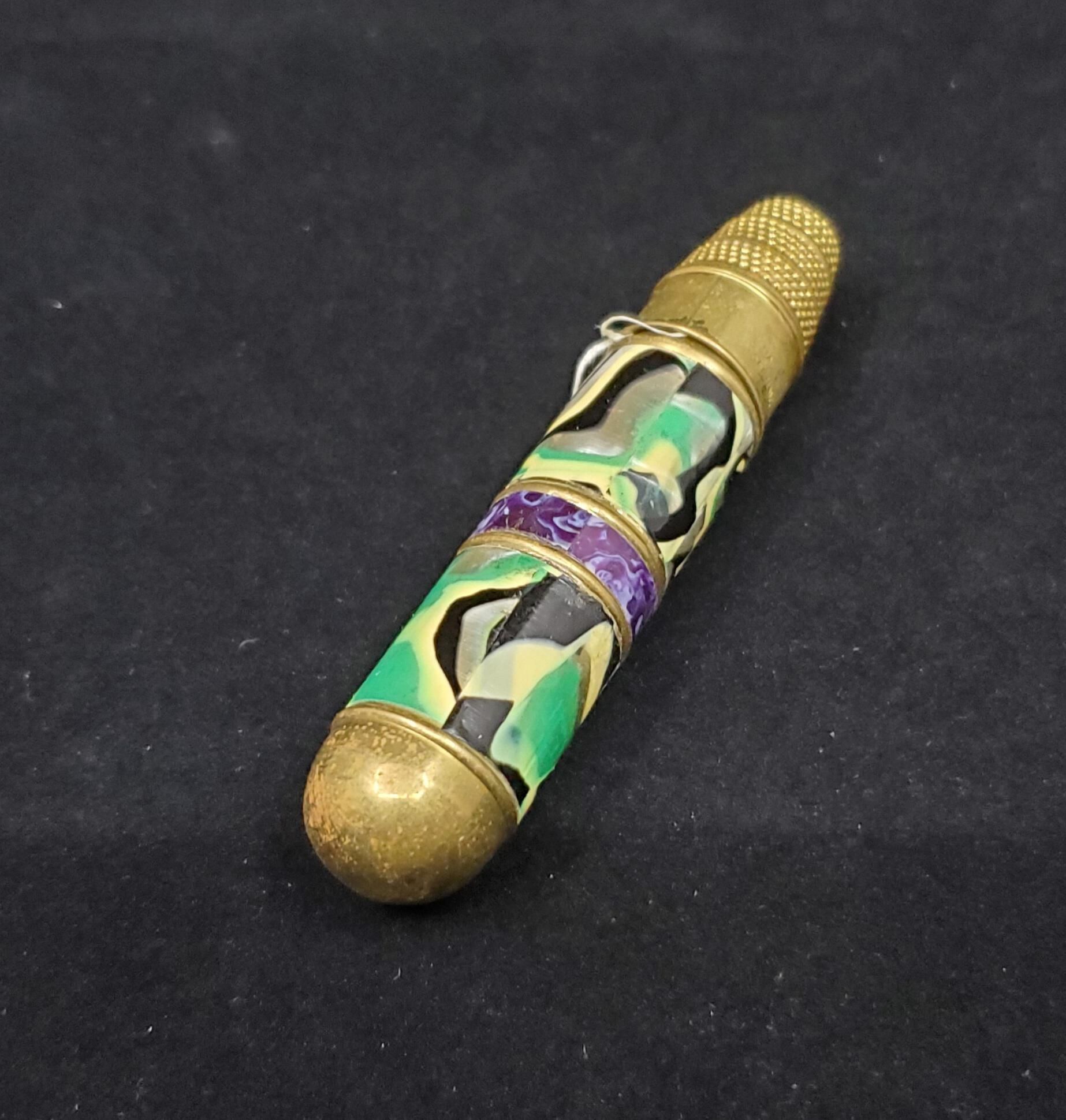 Brass and enamel sewing kit with thimble top. Body of case is mainly blue, green and gold colours.,brass bottom and brass thimble top. inside metal 4 spool bobbin with needle case cente. Case is longer than most of these types.. No marks Brass thimble top of case. Raised rim with wide plain band above. Stamped Made in Germany on band. 3 tiers of knurling above band with a plain raised band betwen. Flat knurled top.