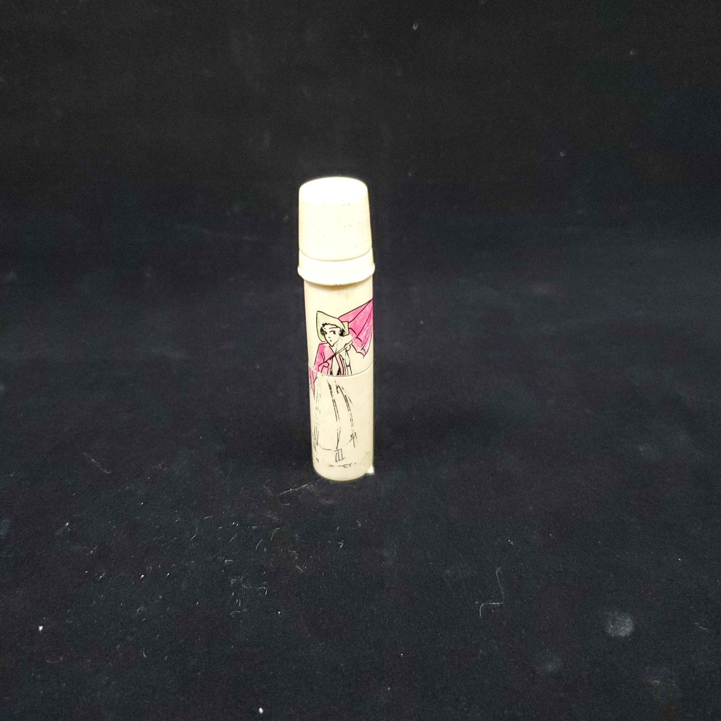 Ivory coloured sewing kit,of early plastc - French ivory. Top of kit is thimble Body of kit has coloured design of lady with umbrella.Colours pink, green but worn off on parts Lower part of case is divided - upper part has 2 thread plastic bobbin with needlecase& top.Lower part empty - for what? Thimble is top of kit. Raised line at rim with wide plain band above,Knurling to top of thimble. Circular lines on flat top act as knurlimg. Screw lines inside to attach. No marks.