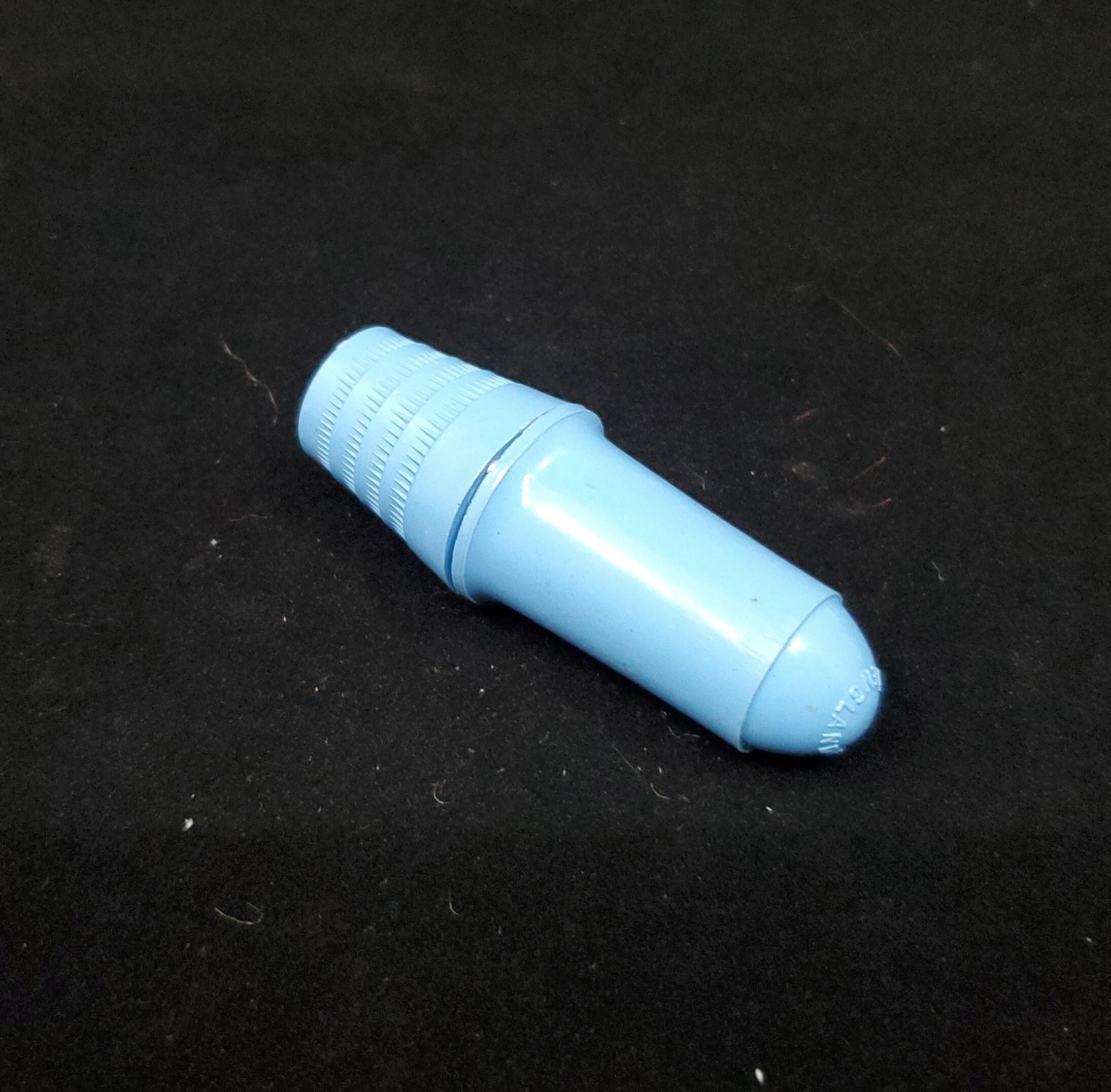 Blue plastic bullet shaped sewng kit with thimbe as top. Stsamped on cone shaped base.Made in England.Black wooden 3 thread bobbin with center as needle case insideTop to center part. Blue thimble serves as top of kit. Flared with wide plain band at rim. 4 rows of vertical lined knurling, ridged, to top. Round knurling on top.