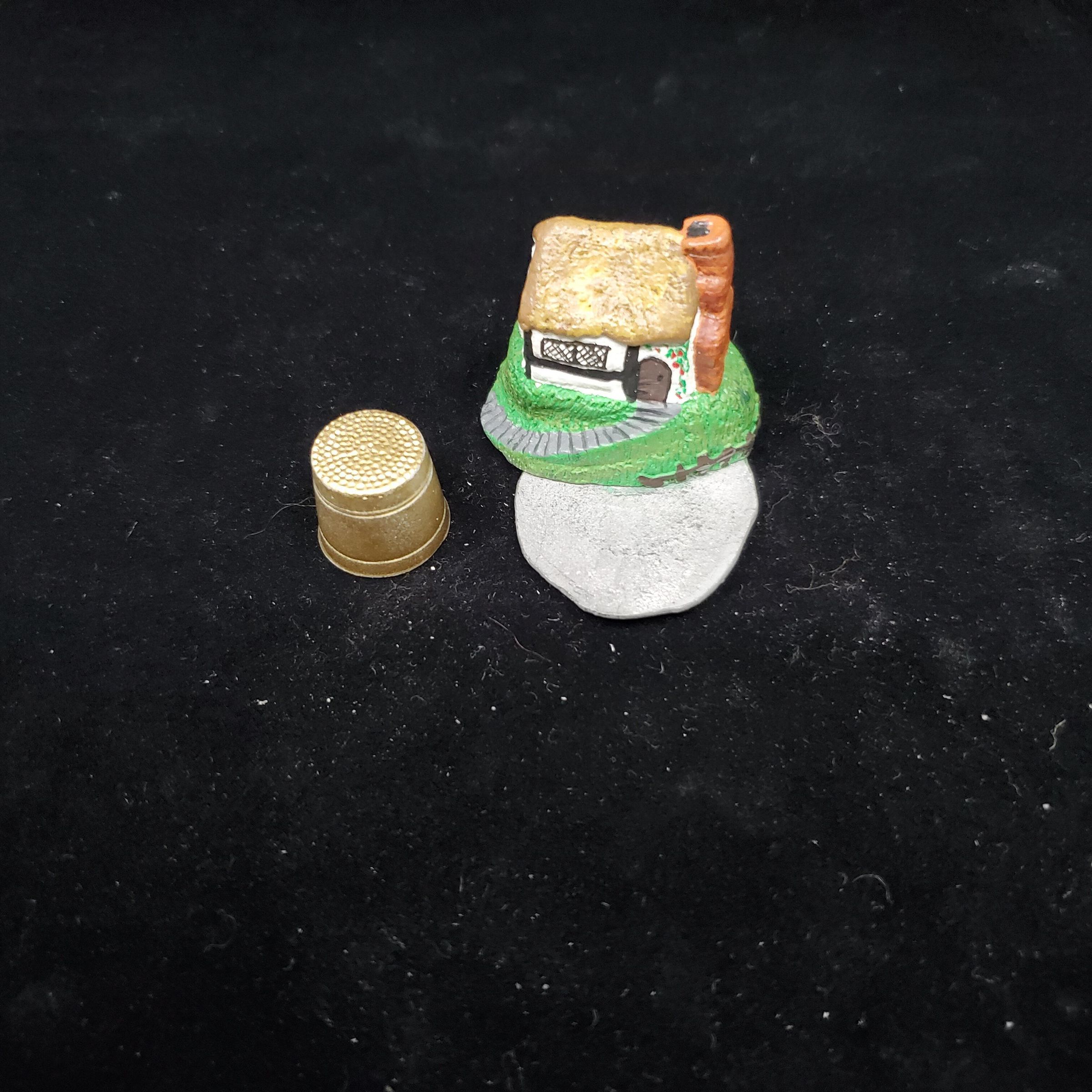 Novelty pewter thimble holder in shape of house. Thimble inside. House is white, black trim, brown thatched roof,red chimney , sitting on mound of grass with steps leading to it., fence and flowers.Bottom slides off to reveal thimble. Heavy, probably pewter also, gold coloured thimble. Flat knurled top. Body plain except for indented line near rim and 2 indented lines near top.. No marks.