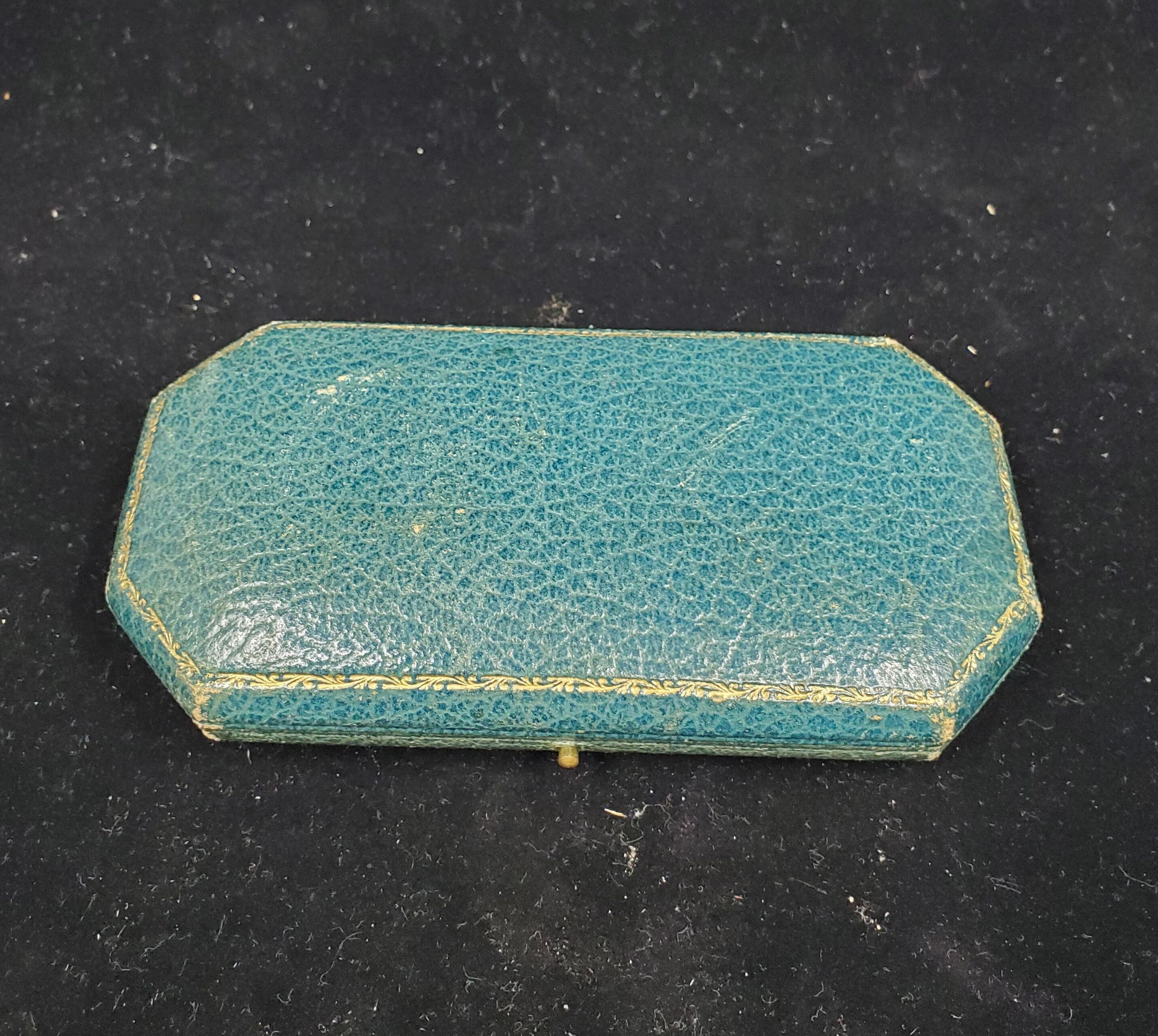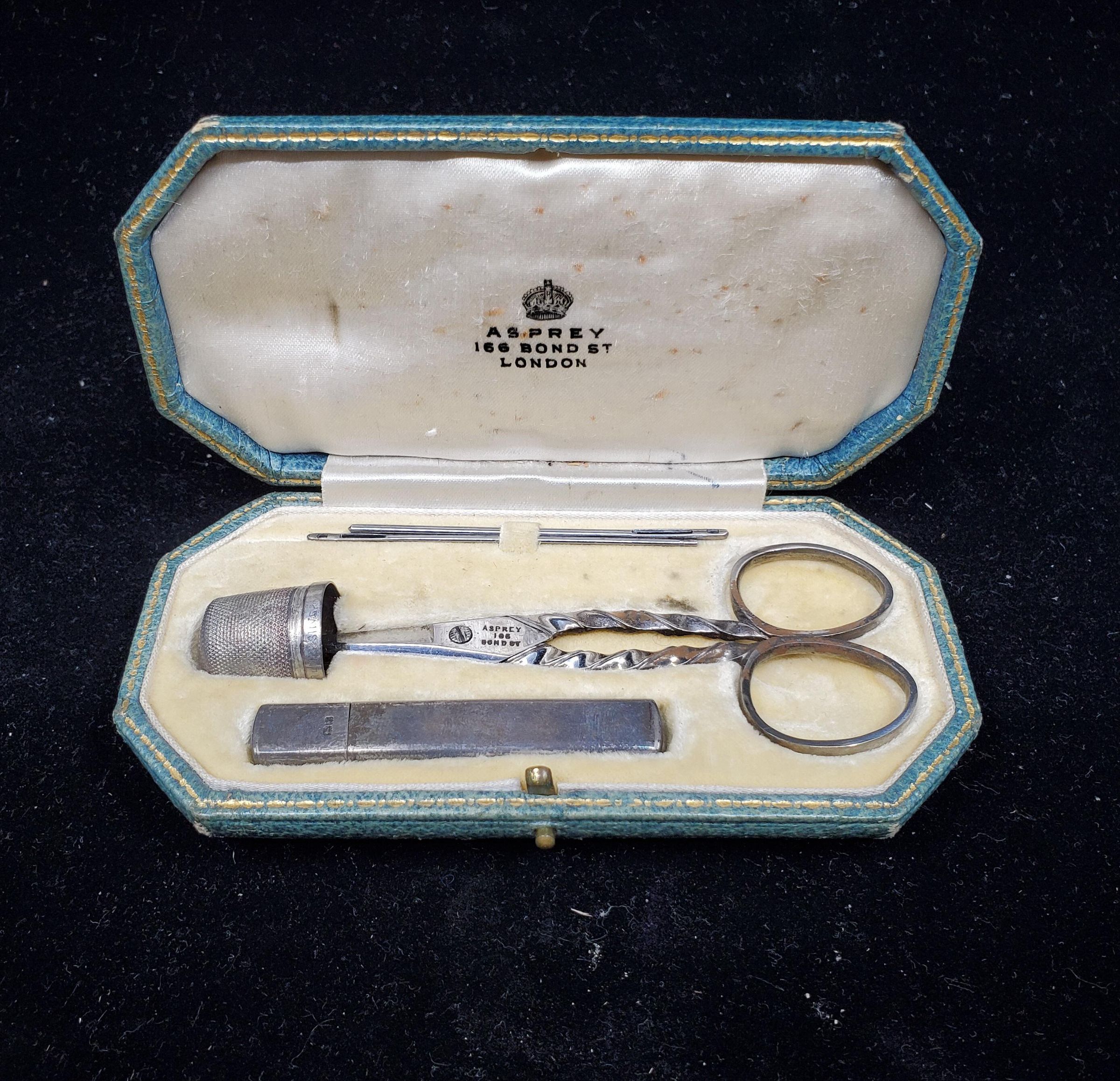 Blue green leather sewing kit trimmed with gold. Cream satin inside top Inside stamped with crown and ÒAsprey 166 Bond St. LondonÓ Pale yellow velvet carved bottom layer containing 2 steel bodkins, scissors (steel) stamped Asprey,silver needlecase hallmarked 1934 & maker JS.&S,Birmingham,silver thimble Plain silver thimble with raised band at rim. Stamped Sterling Silver Made in England and size 16. Indented band above then knurling to and over top..