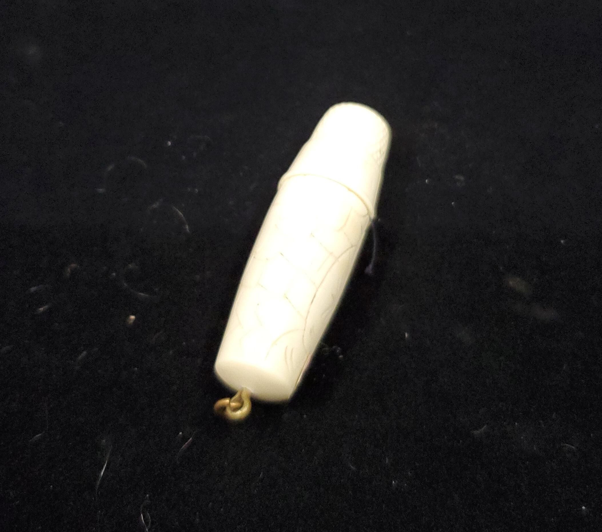 Ivory coloured bullet shaped sewing kit. Probably bakelite. Thimble forms top. Base has Oriental figures incised against a stone wall. Inside cream coloured plastic 4 thread bobbin with center for needles. No marks. Case end has brass fittings for tassel. Thimble is cream coloured with raised rim. Wide band above with Oriental letters around. Knurling from band to and over toip inside scew lines.