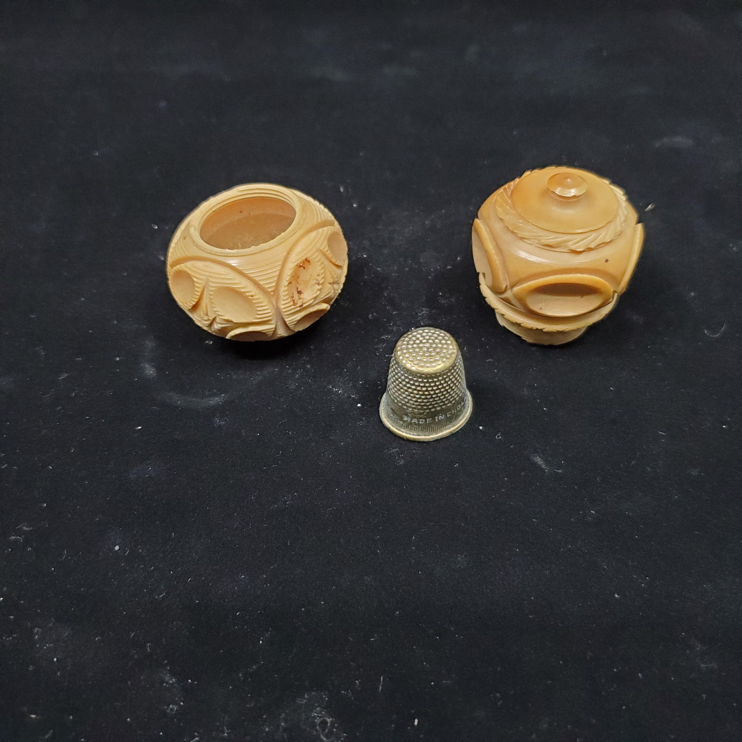 Carved hoiney coloured vegetable ivory thimble holder. Brass thimble inside case with raised rim. Narrow band of vertical lines above then a wider plain band with ÒMade in EnglandÓ and 2 stamped on it. Knurling from band to and over top.