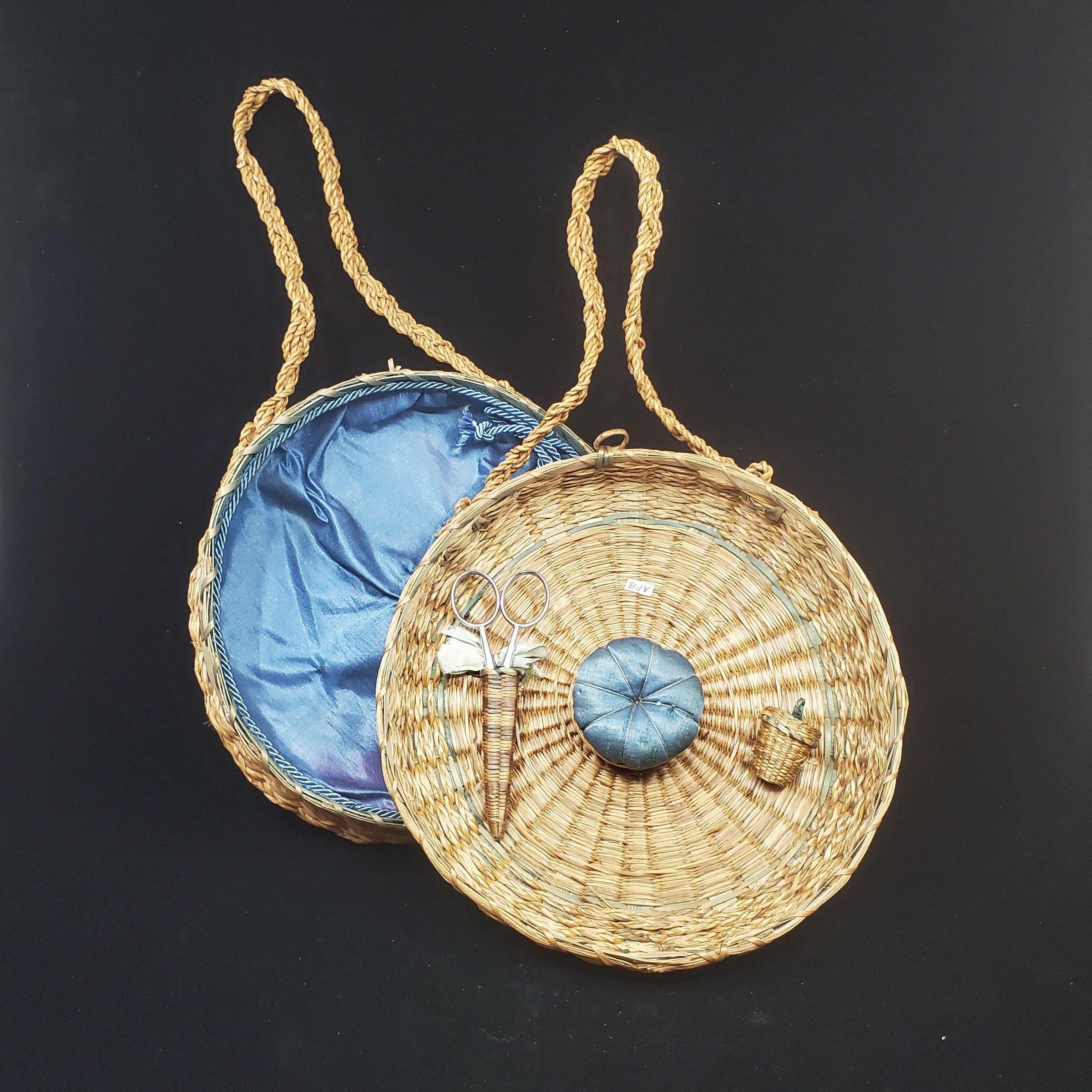is mostly beige colour but shows green in places. Lower is lined with blue satin. upper has pin cushion basket with blue satin top. Also has scissor sheath of grass containing 4 1/2Ó scissors stamped Charm and F.W.Engels, Solingen, Germany.Thimble in grass case, with cover. Plain nickel thmble with rolled rim. Narrow band of slanted lines above, then a wide plain band with size & stamped on it. Knurling from here to and over top.