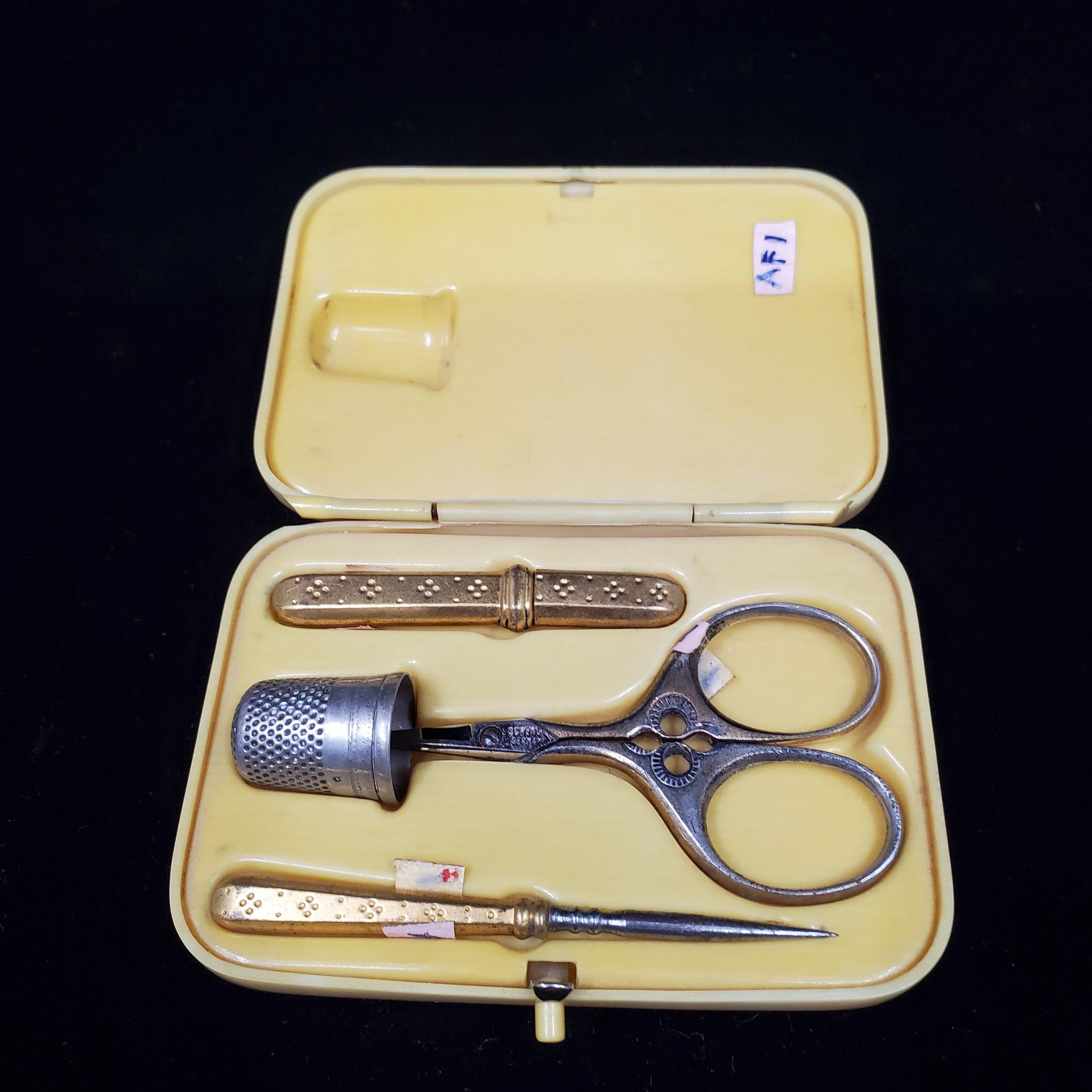 Ivory sewing kit with molded positions. Contains gilt silver needle case, stiletto, embridery scissors and thimble. All gilt except thimble. Thimble is worn, out of round with raised rim. 2 narrow bands above, one of which looks like it has had a pattern. Knurling from band to and over top. No marks.