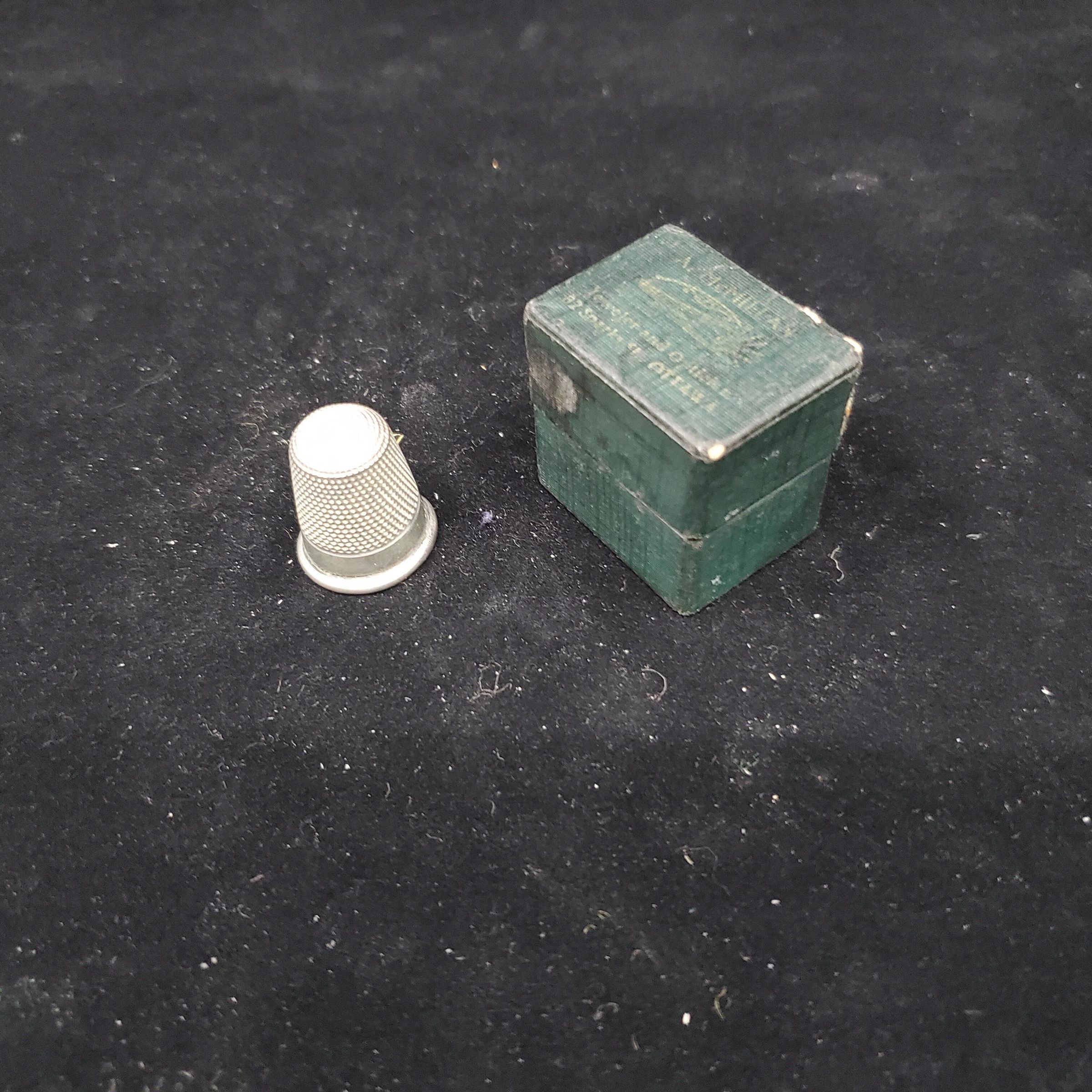 Small black cardboard box with gold lettering on outside ÒMcMillan Jeweller & Optician 32 Sparks St. OttawaÓ and an engagement ring on top of box. Inside lined with cream coloured velvet. Tall plain steling silver thimble with rolled rim. Wide plain band above with marks - (Size )11, Sterling 925 and a shield with A on it. Knurling from band to and over top. Out of round.