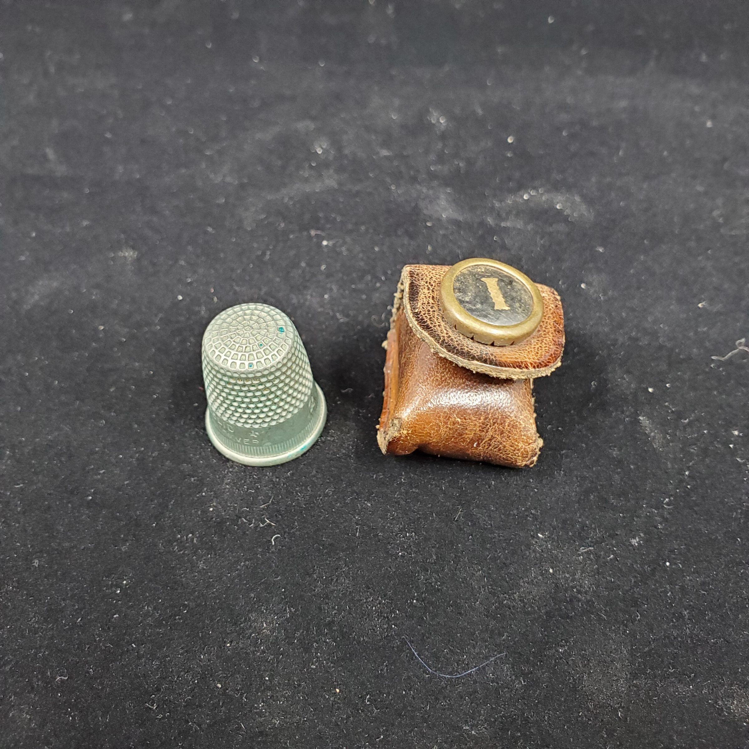 Brown leather case, very small, t=with large dome (1/2Ó) fastener. Fastener is circular, brass eith black inside and the letter or number I in gold. Inside thimble. Silver coloured thmble with rolled rim. Narrow band of vertical lines above then a wide plain band with size 2 marked on it. Also ÒSolid Nickel SilverÓ with a 5 sided figure (?) either side of it Knurling from band to and over top.