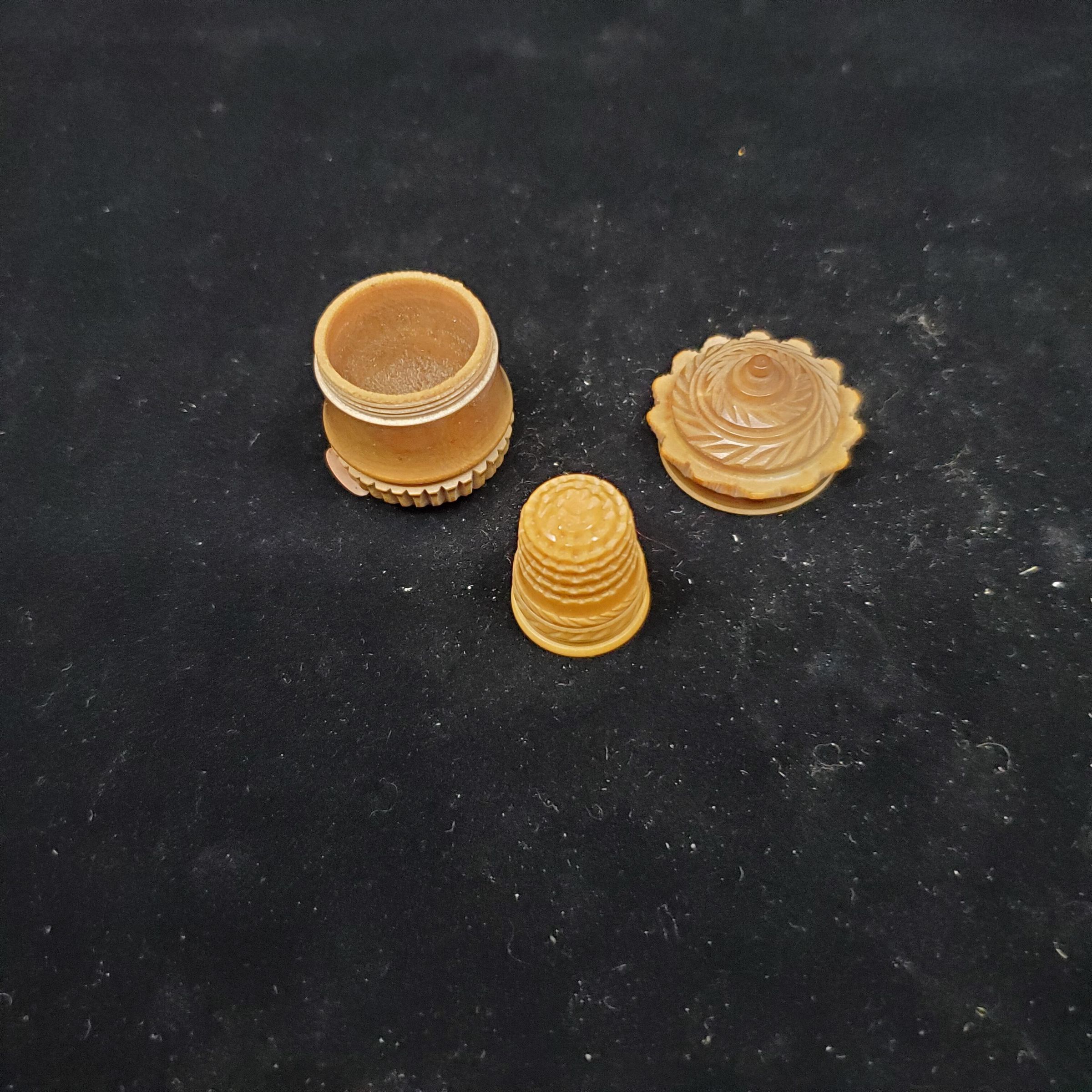 Vegeable ivory thimble case with thimble. Vase shaped case. Nicely carved top and a row at base of case. Light birown in colour.No marks. Light brown vegetable ivory thimble with raised rim. Plain band above then 2 narrow bands of carved diaginal lines. Plain band above then rows of knurling to and over top. No marks.