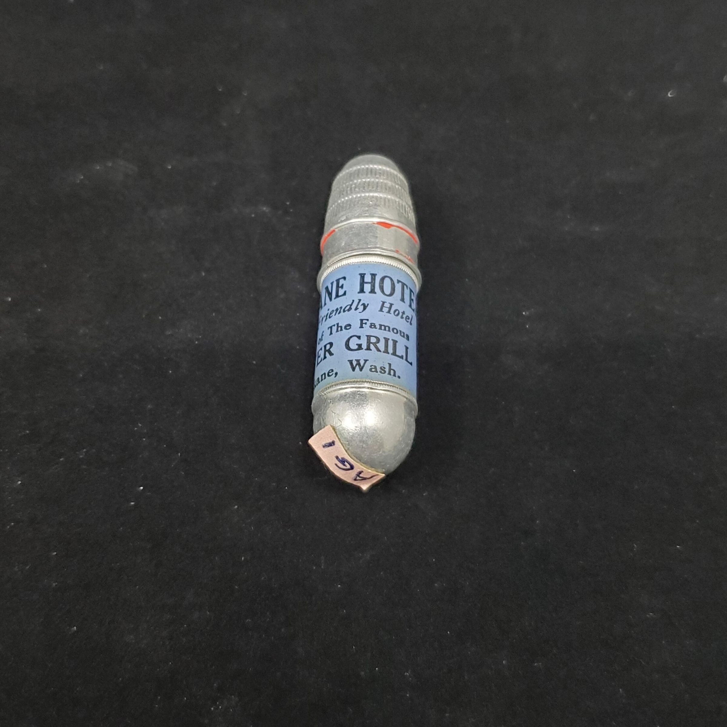 Bullet shaped aluminum sewing kit with thmble top. Advertisng. Bluey purple band on lower case with black printing ÒSpokane Hotel Your Friendly Hotel Home of the Famous Silver Grill Spokane, Wash.ÓInside wooden 2 thread bobbin with center needle case & top. Top of case is aluminum thimble with raised rim. Remains of wide red band above, then 3 rows of vertical lined knurling to top Round knurling on recessed top.