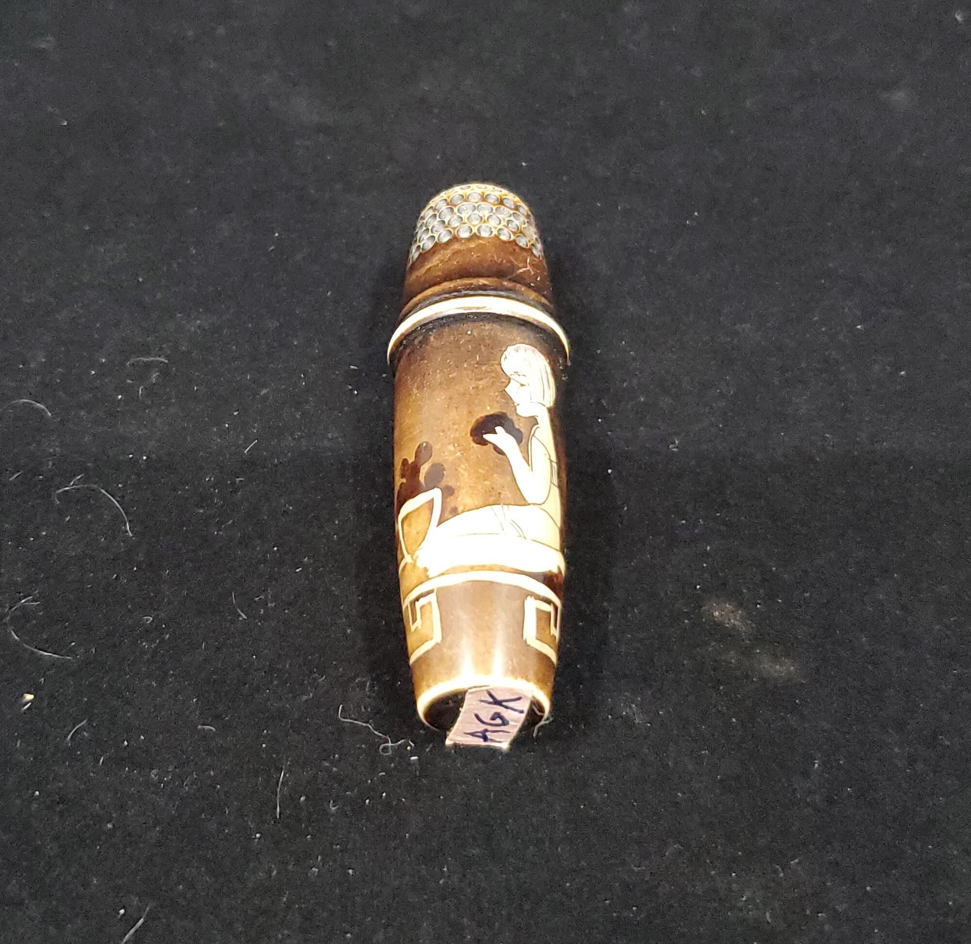 Bullet shaped brown coloured sewing kit with thimble top.Art Deco design - signed - around body of case -Flapper girl in undies sitting on bed, Signed MM 3 thread cream coloured bobbin with needle case center and top inside. End of kit is thimble. Dark brown colour with cream coloured rolled rim. Wide plain band above then knurling to and over top.. Screw lines on inside which is cream coloured.