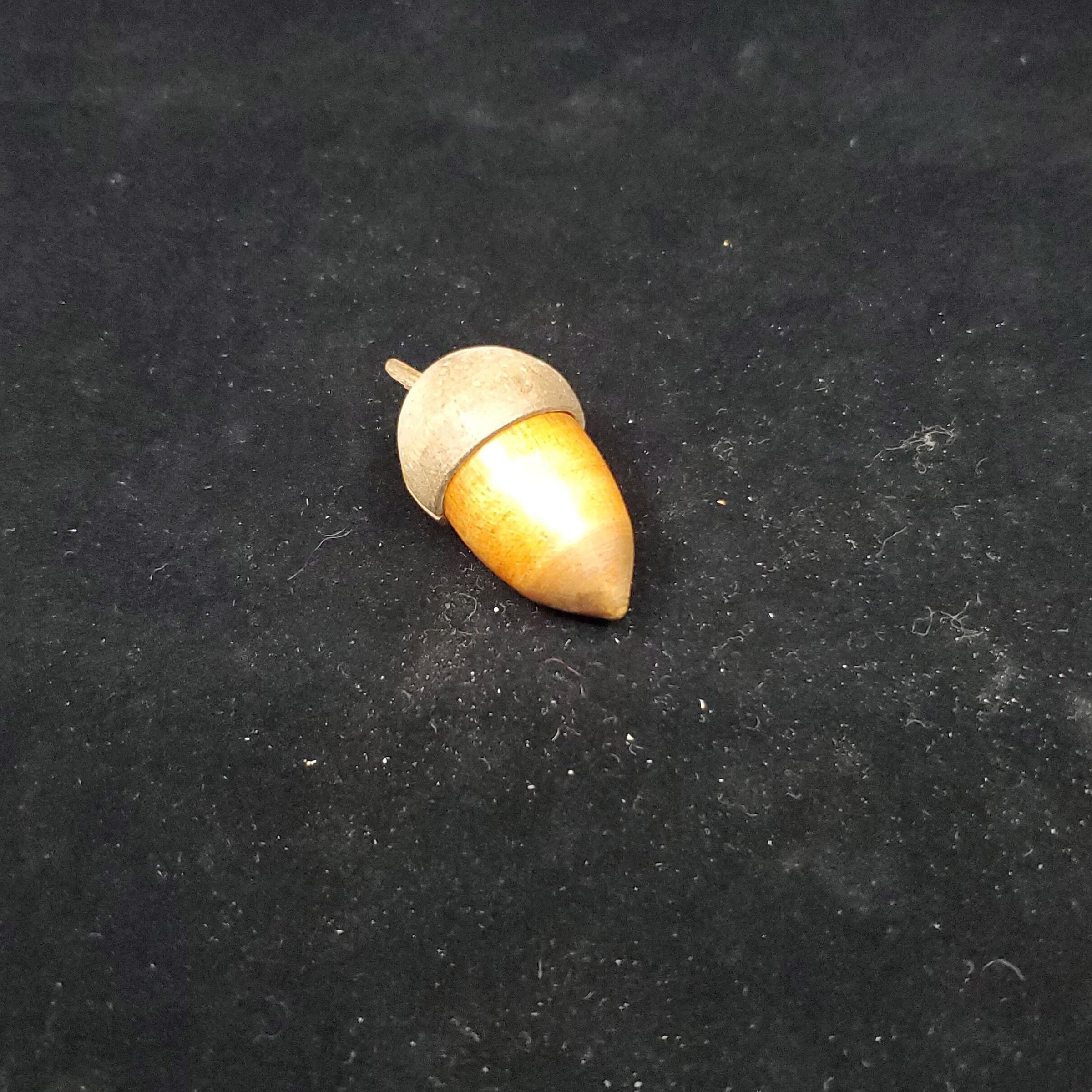 Olive wood thimble holder in shape of acorn. Top-olive brown in colour - has stem and is unfinished wood. Bottom of case is reddish brown,finished wood. Inside blue velvet thimble holder with thimble.No marks Silver thimble with narrow raised rim. Fish scale pattern on rim. Knurling from rim to and over top. Few holes. Seems to be a punch mark above rim.
