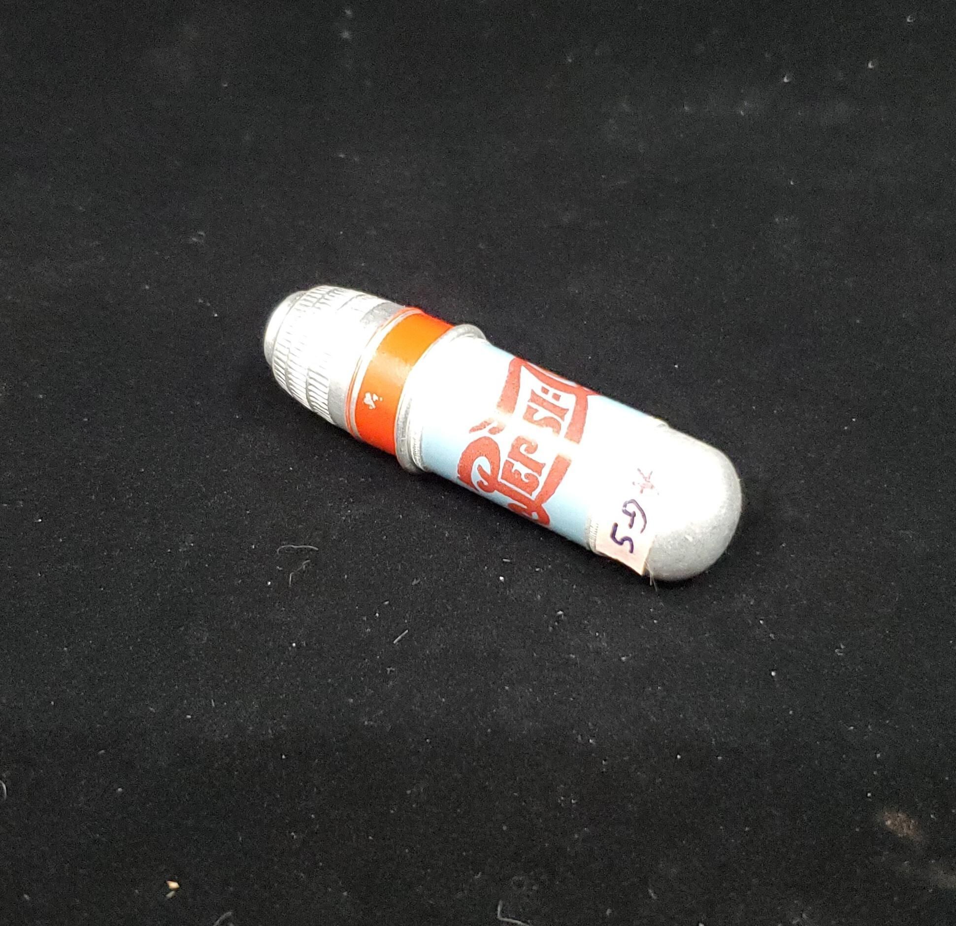 Advertising aluminum bullet type sewing kit with thimble top. Red, blue and aluminum colours. Lower part of case is blue with red printing advertisingÓPepsiColaÓ Inside case is wooden 2 thread bobbin with needle case center with top. Top of case is thimble with rolled rim. Wide red coloured band above rim then a narrow plain band. Knurling - vertical lined type - from here to top.Round knurling on top. Push on top. No marks.