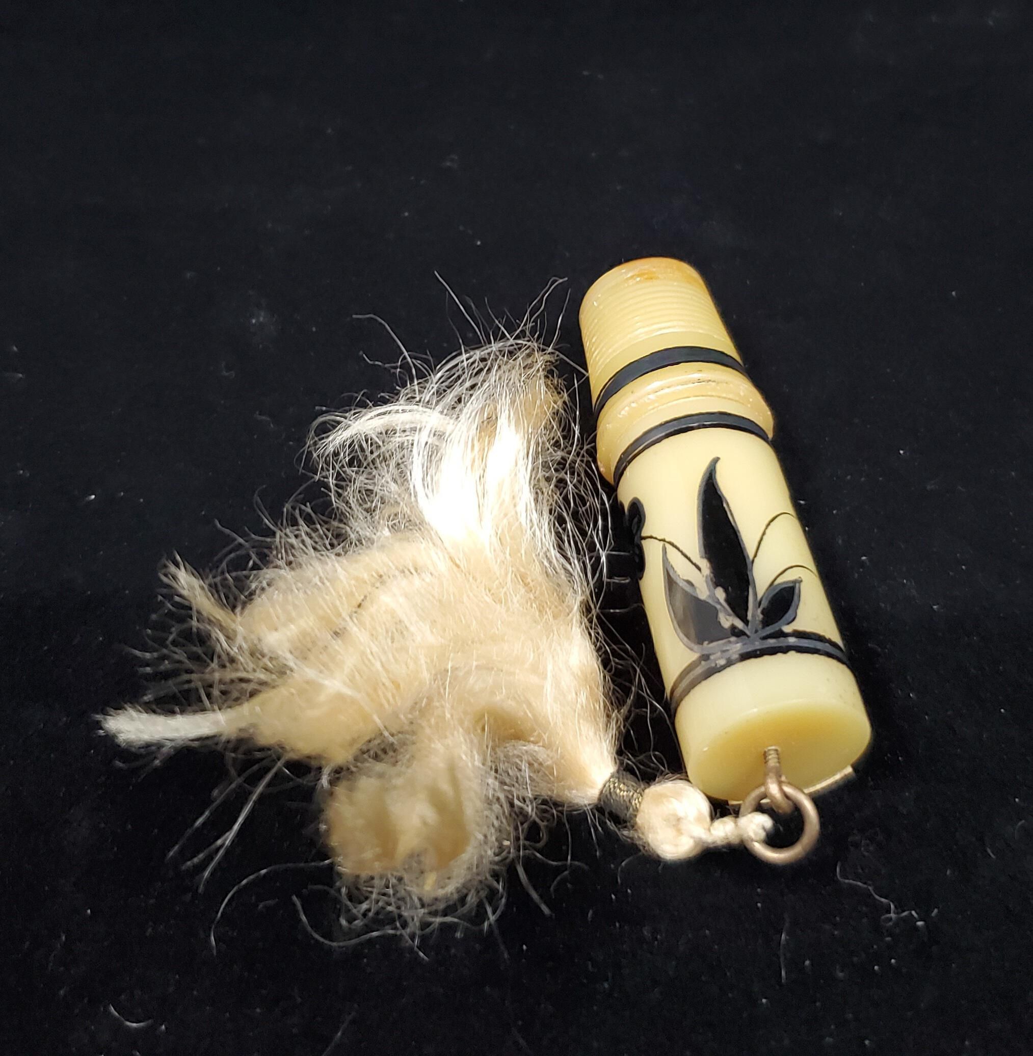 Early plastic - celluloid ? bakelite? sewing kit with thimble top. Gold colour with black flower design around body of case. Black bands on case and thimble. Brass fitting at end to hold yellow tassel. Thimble top.No marks. Thimble end of sewing kit. Yellow colour with raised rim. Narrow black band above, then horizontal lines to top and over top, as knurlng. Screw lines inside for removal.