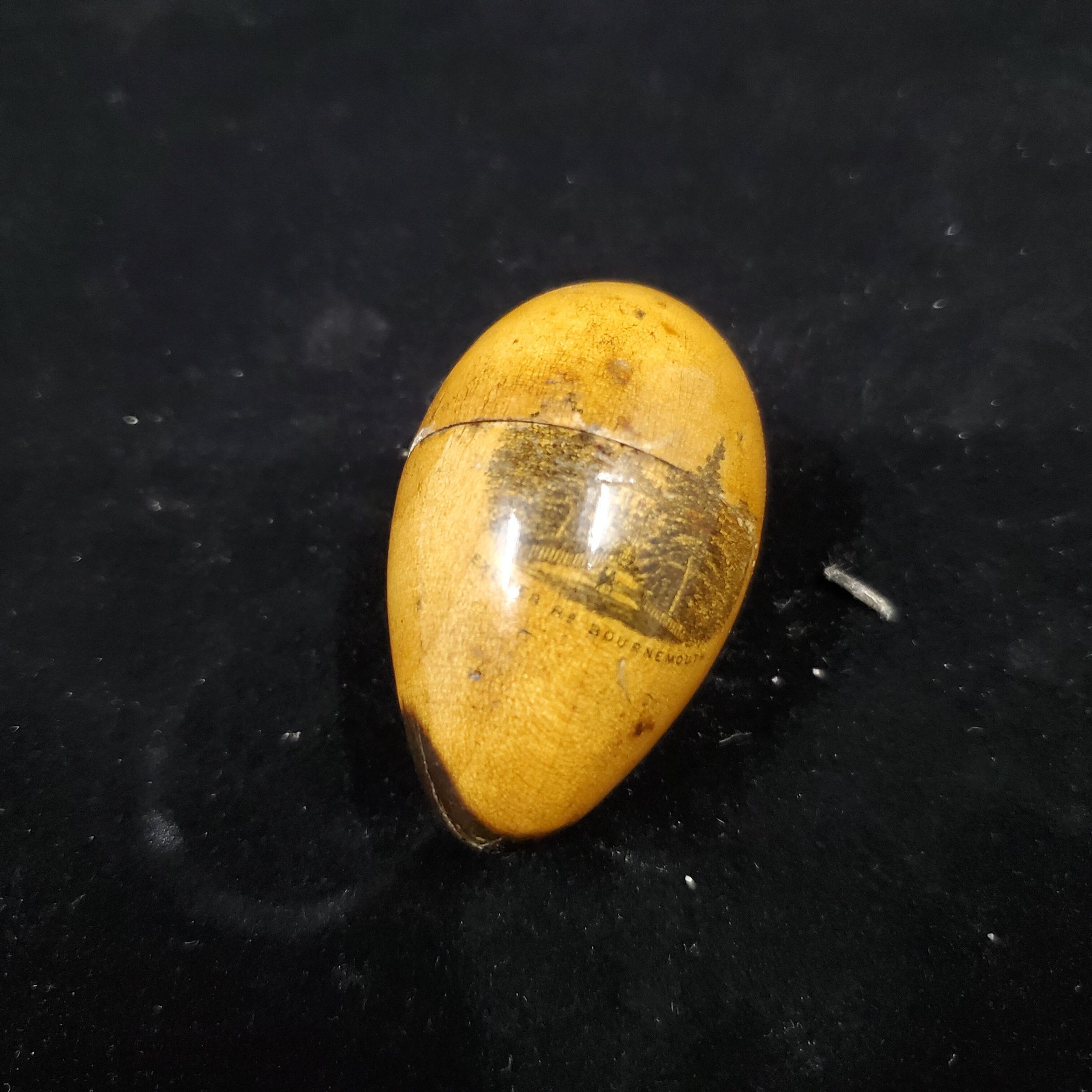 Oval shaped wooden Mauchline ware thimble case and sewing kit. Blond wood - probably sycamore with dark piece at point of oval. Scene of Exeter Rd. Bournemouth - some of which has worn off. inside wooden needle and thread post , 2 thread bobbin and thimble included. Silver coloured metal thimble with rolled rim. Narrow band of vertical lines above, then a wider plain band with size - 5 - stamped on it. Knurling from here to and over top.