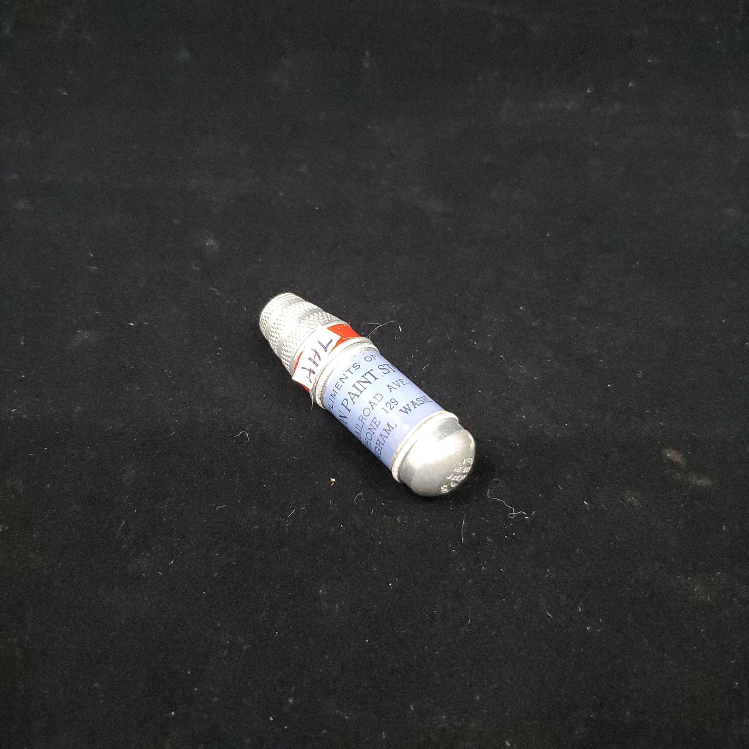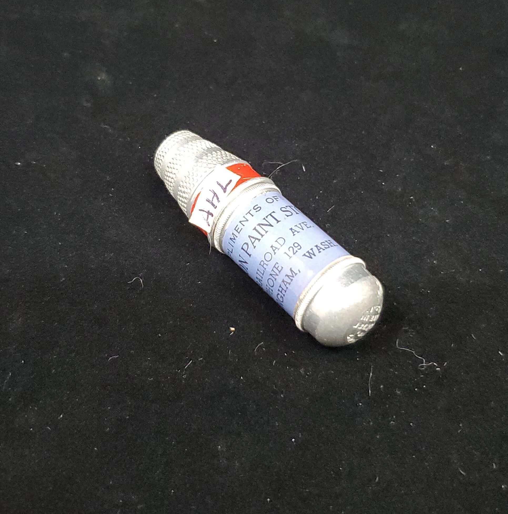 Bullet shaped aluminum advertising sewing kit. Body of case is blue, with advertising ÒCompliments of Stockton Paint Store 1413 Railroad Ave,Bellingham, WashÓ Inside wooden 2 thread bobbin with needle case center and red wooden top.Stamped Patent No.2884780 Made in U.S.A/ Top of case is thimble - aluminum with red painted band at rim. Knurling in 3 sections to top with plain bands between. Knurling over top. Push on to lower part of case.