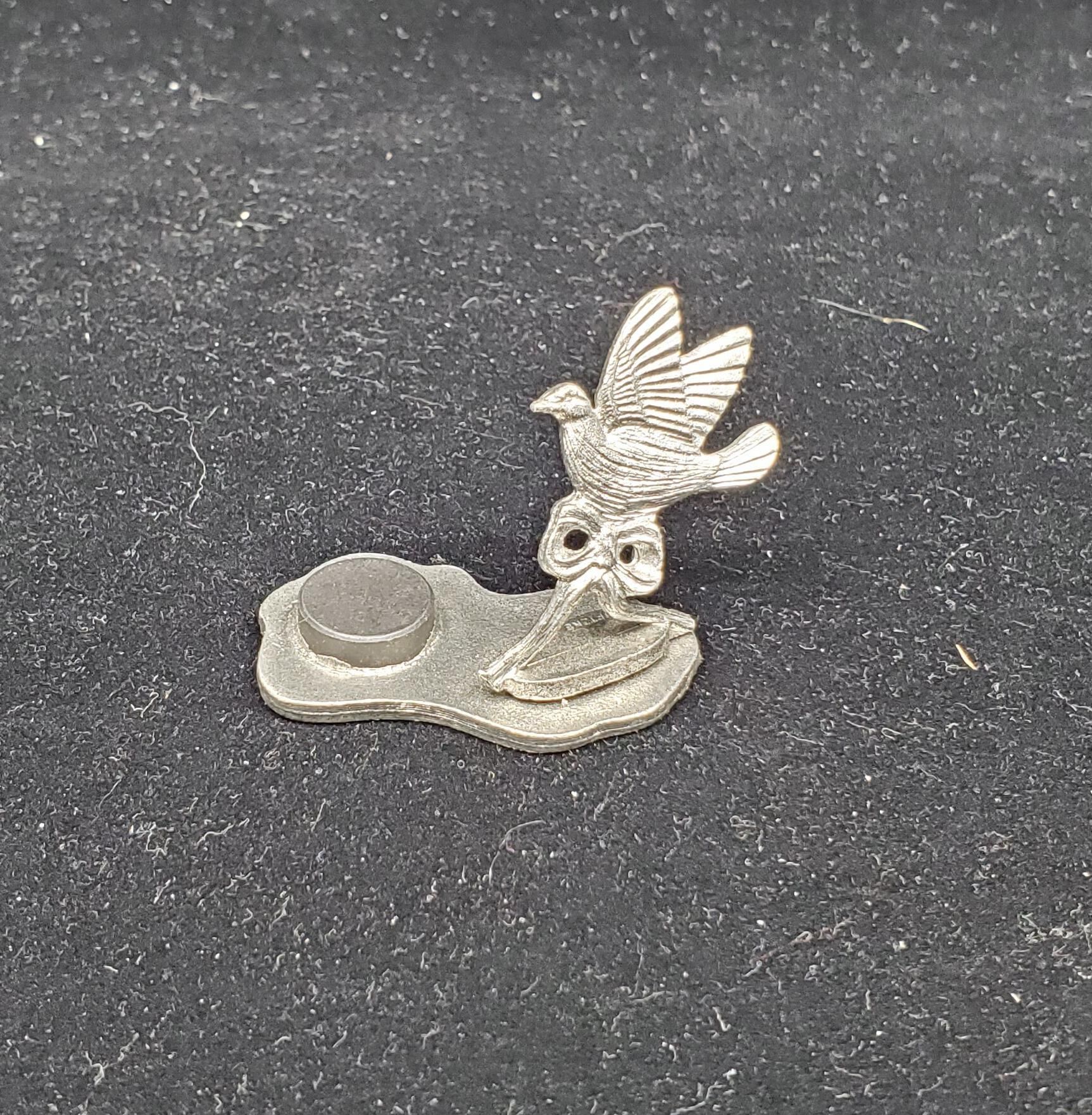 Pewter thimble holder. Metal bird with wings open on irregularly shaped flat metal stand. Round shaped magnet at other end of base to hold thimble Thimble included.Stamped on bottom of base ÒMetzkeÓ and 1979 Plain steel thimble, gray colour, with rolled rim. Narrow band of vertical lines above rim,then a narrow plain band. Knurling to and over top. Stamped Spain inside top.