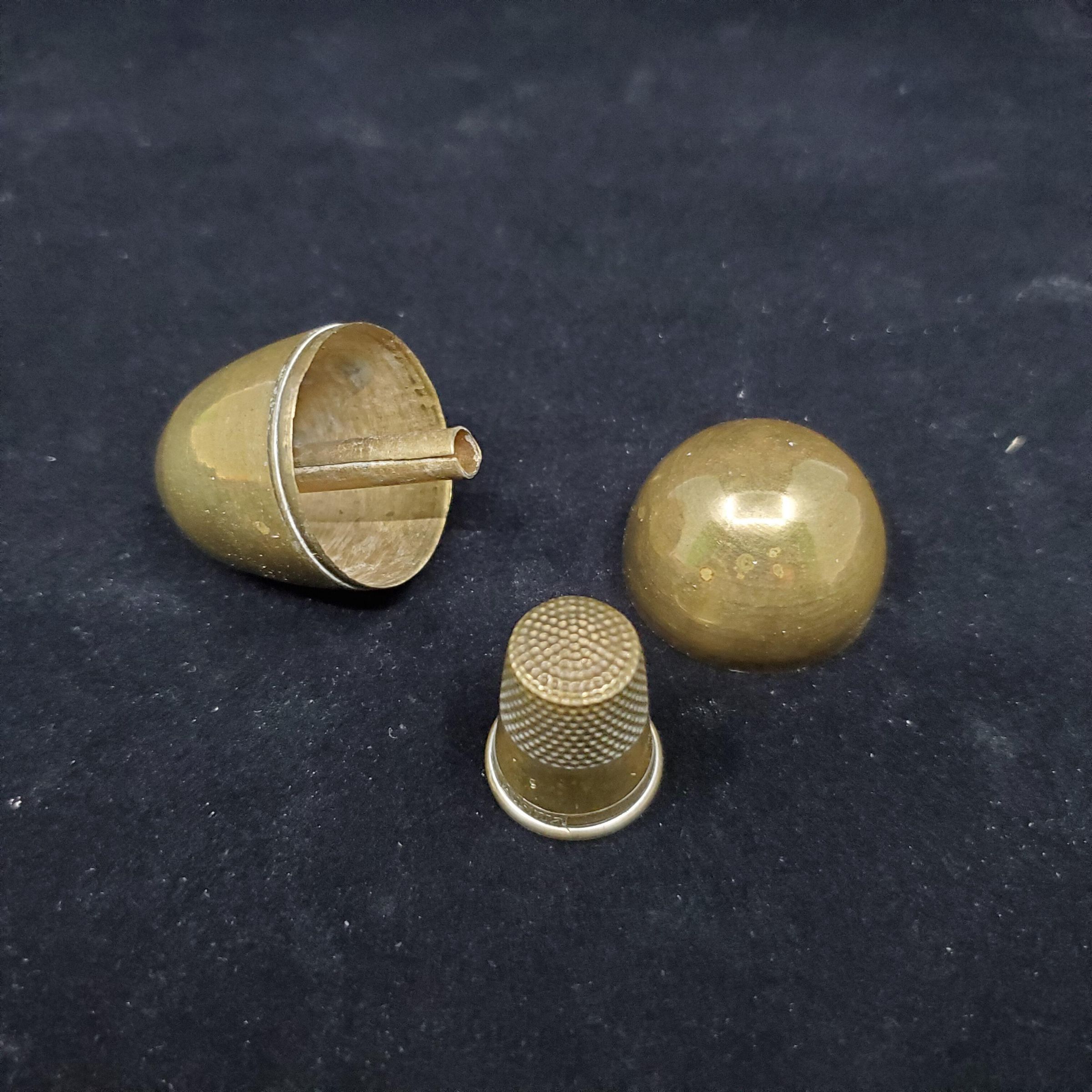 Brass thimble case, egg shaped. Very plain. Inside brass spindle - could be needle case - no top. Thimble. No marks. Brass thimble with rolled rim. Narrow band of vertical lines above. Austria stamped in this band. Wide plain band above with size - 9 - stamped on it. Knurling to and over top.