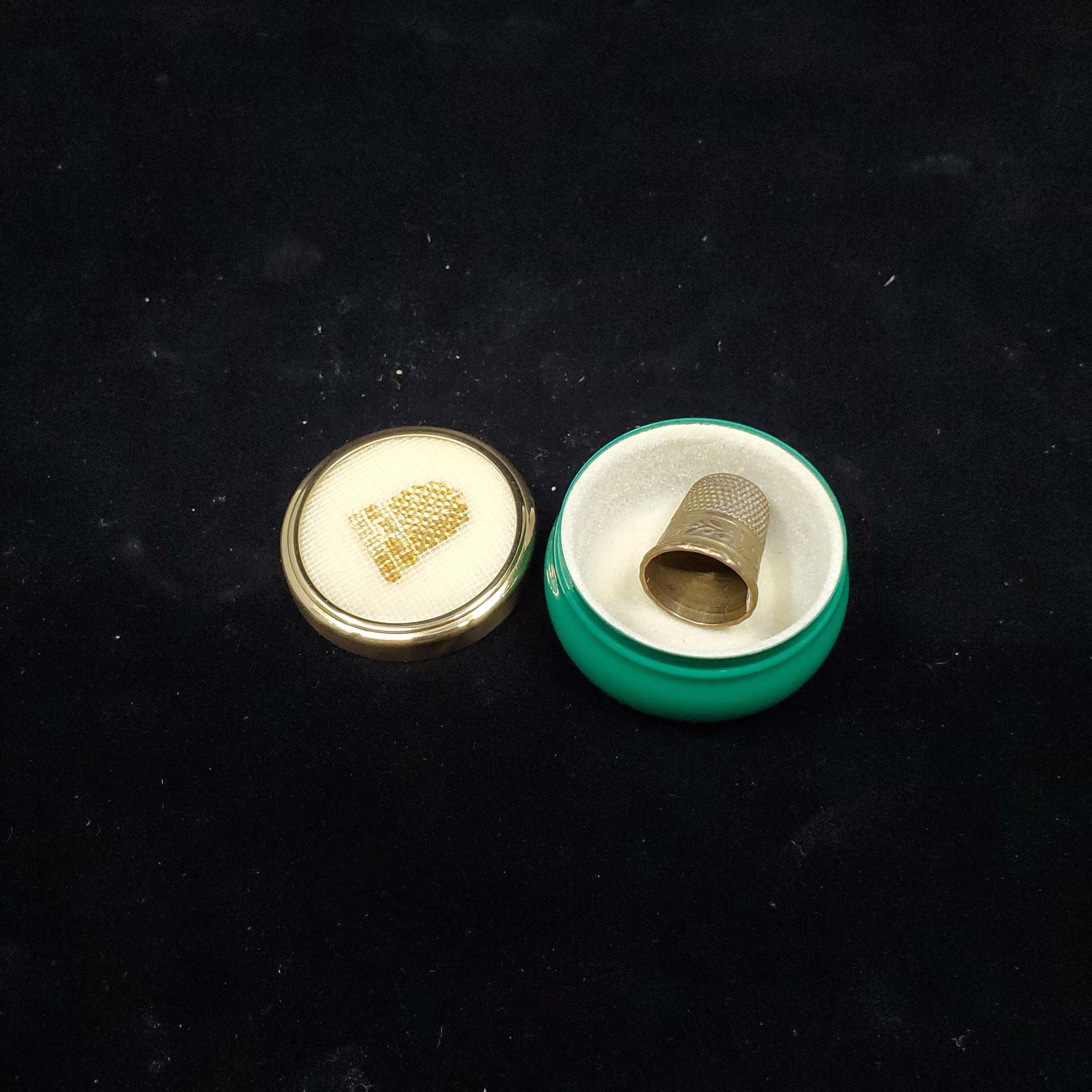 Green round thimble metal box with gold rimmed top. Center top has hand worked petit point of a gold thimble on it. Inside cream felt like material lines case. Thimble included. Old brass thimble with raised patterned rim. wide band above with a vertica lined background and horizontal row of acanthus leaves around. Knurling fom band to and over top. No marks.