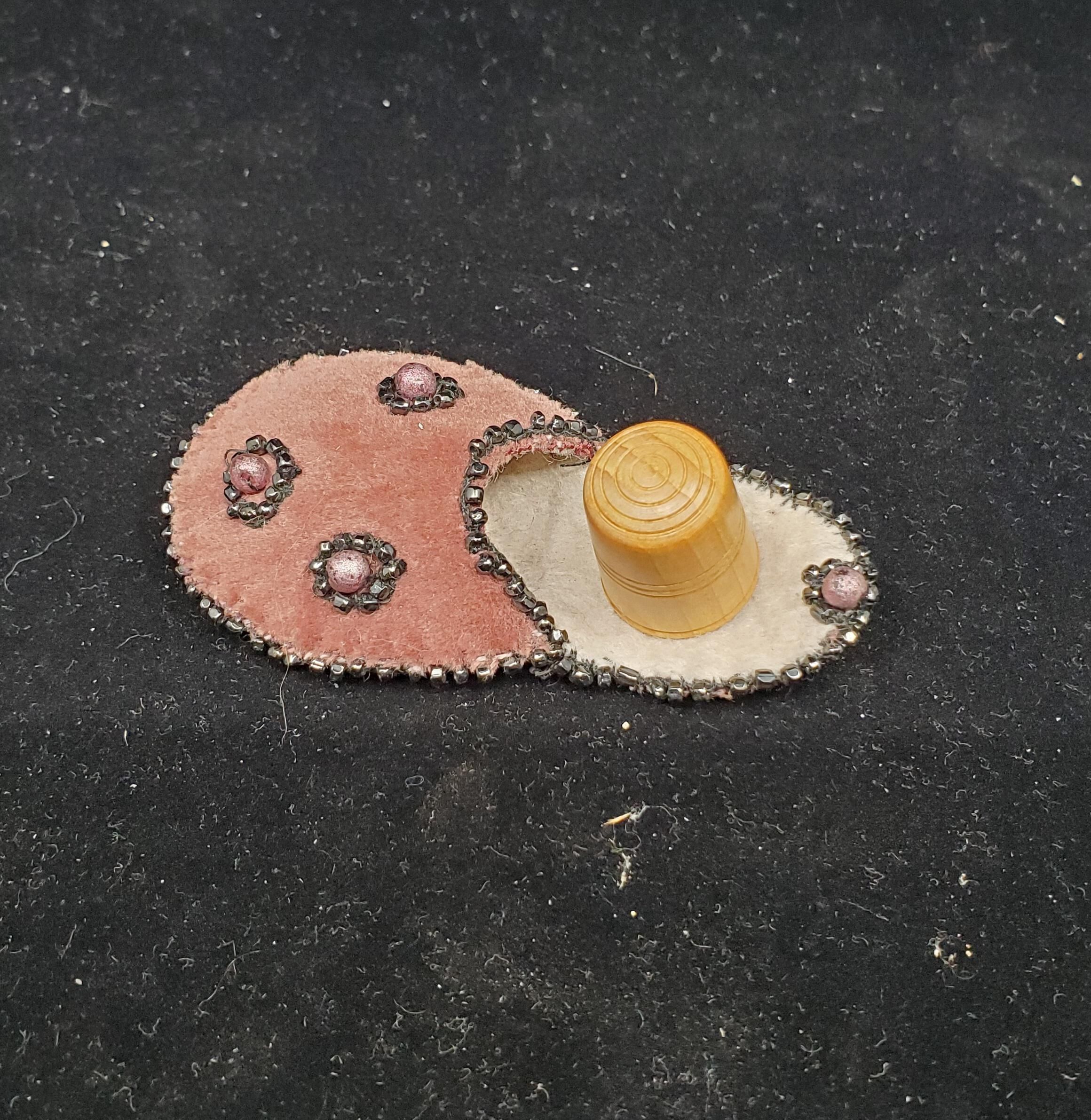 Purple velve slipper, lined with white felt. Decorated with cut steel beads around edge and on toe in a design with round purple bead in center. Thimble included. Light coloured wooden hand crafted thimble. Made from a Cedars of Lebanon tree lost from the garden of Kedros House, Lymingtom, Eng. in storm of 1987. Turned by Vernon Waters. Thimble has circular indented lines on top as knurling. Design of indented lines around body of thimble and at rim.