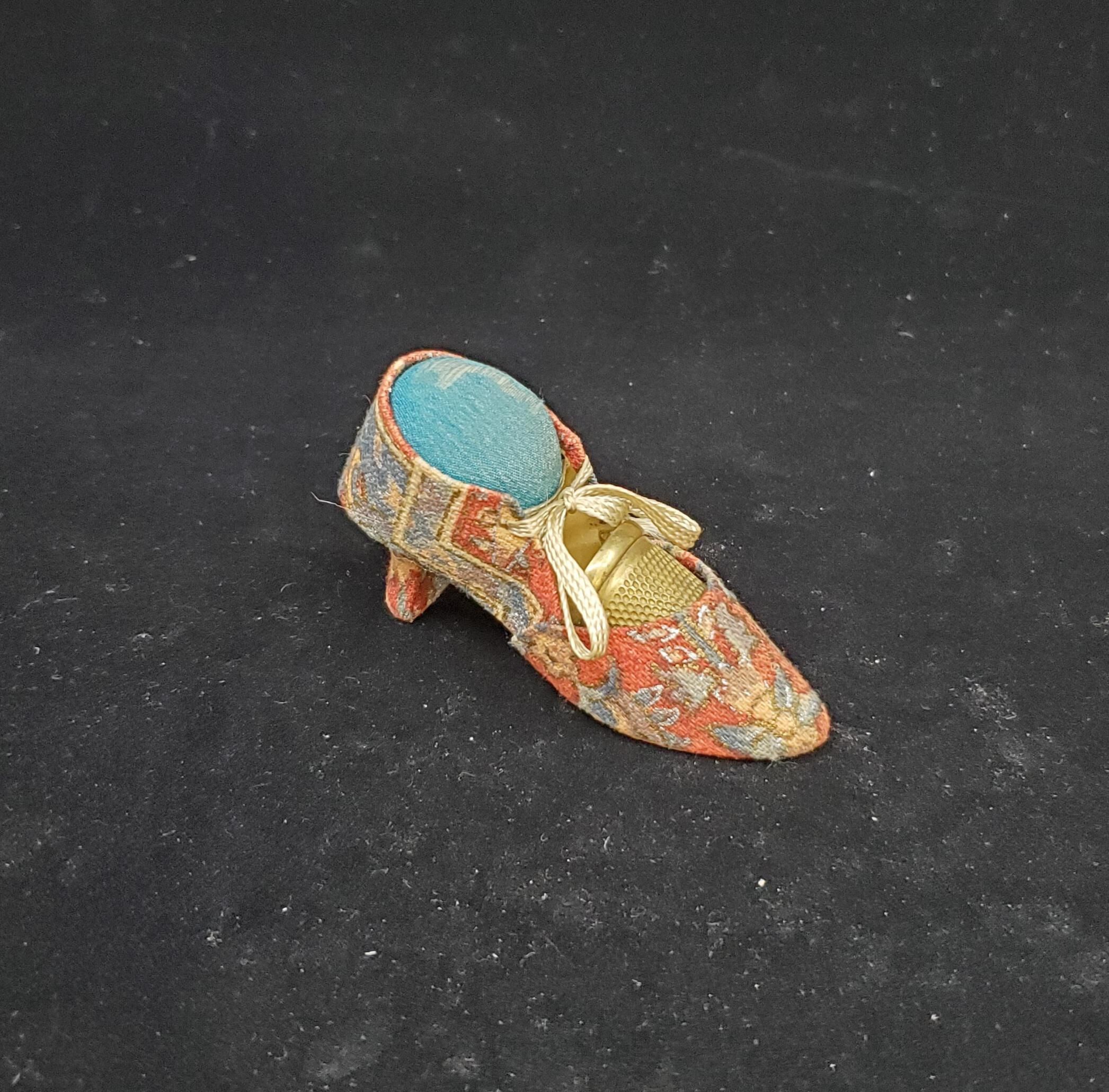 Shoe Slipper Thimble Holder and Pin Cushion. Thimble missing as purchased.Multi-coloured fabric shoe Cushion in heel a blue green colour. Cream coloured ribbon tie. Shaped high heel also covered with fabric.Leather coloured sole stamped Made in Japan. Also #179. Brass thmble added. Rolled rim.Narrow plain band above then knurling to and over top.