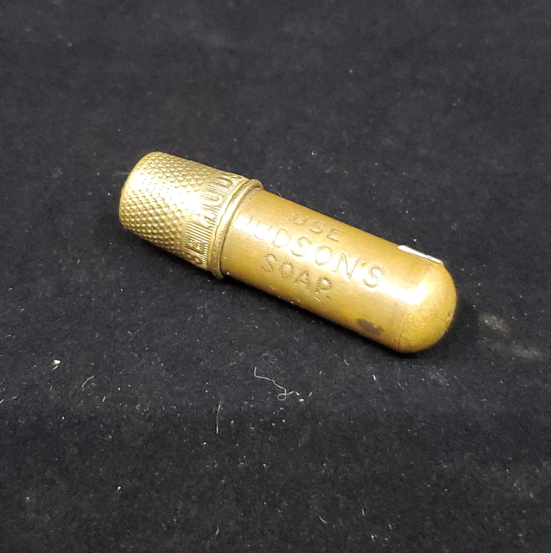 Brass bullet shaped sewing kit. Advertising. Thimble top of case.On case ÒUse HudsonÕs SoapÓ on side. On bottom of case T.R.G.S.Ltd. Inside case brass 3 thread spindle with neeedle case center. Top of case is thimble Rolled rim. Wide band above with vertically lined background and ÒUse HudsonÕs Soap around. Knurling from band to and over flat top.