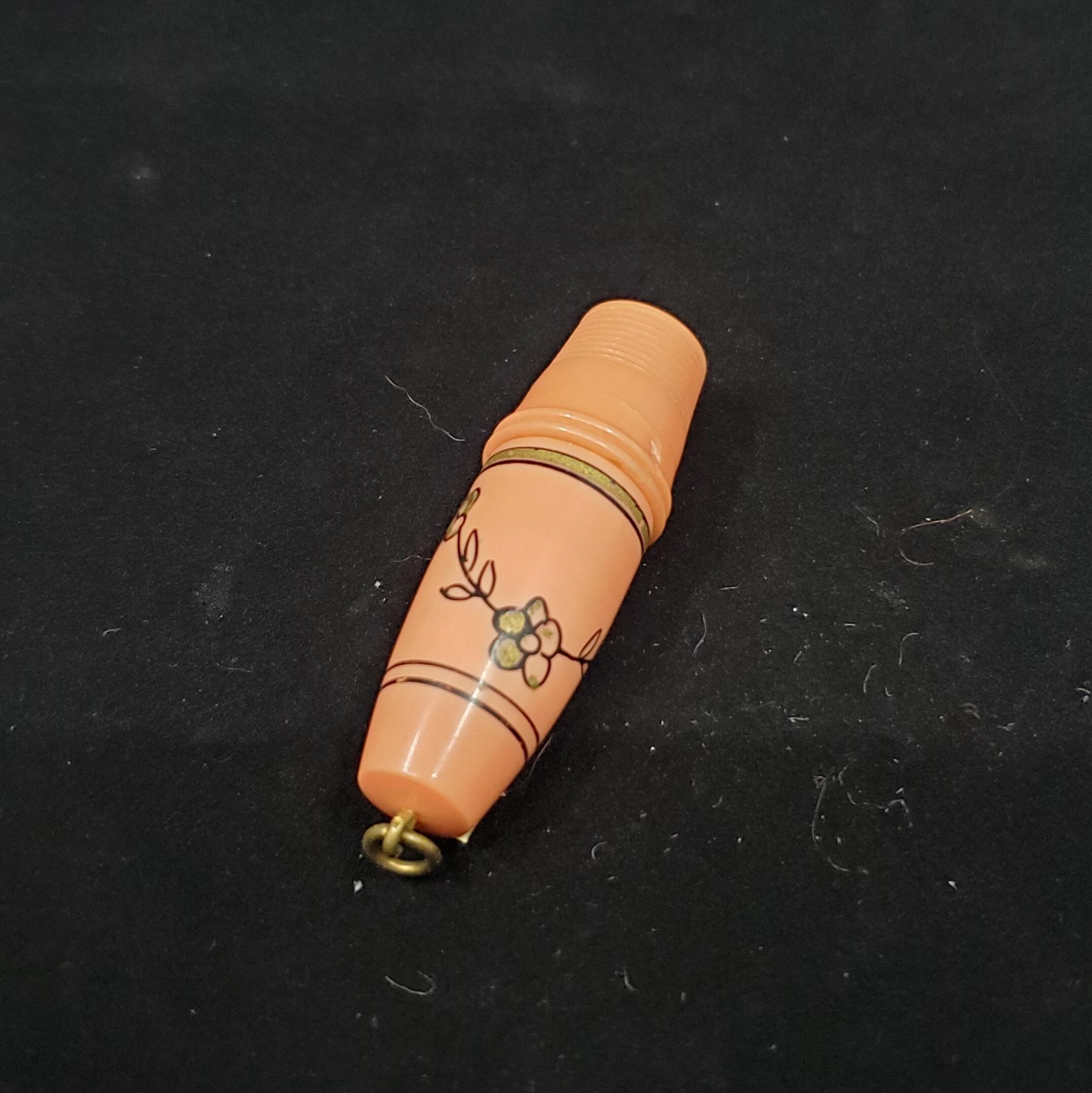 Peach coloured early plastic (Celluloid?) sewing kit with brass ring a one end. Thimble forms top. Main bdy is decorated with a chain of gold flowers and leaves, outlined in black. Gold and black bands at top and lower part of case. Inside 3 thread peach plastic bobbin with needlecase center. Top of kit is peach coloured thimble with 2 rolled rims at lower end. Wide plain band above then horizintal lined knurling to and over top. Crack near rim. Screw lines inside to fit onto bottom of kit.