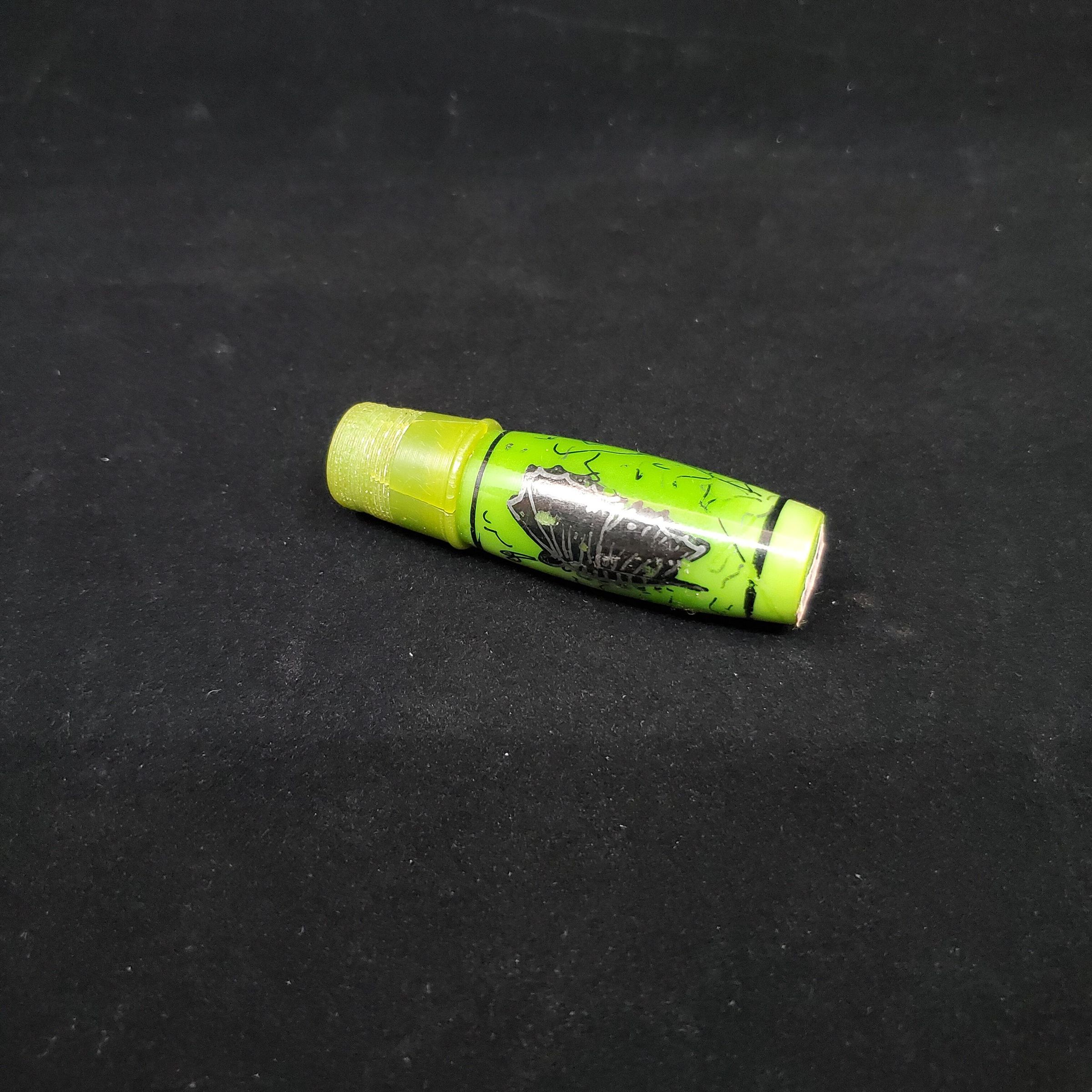 Green early plastic (bakelite?) sewing kit with thimble end. Design in black on body of case - butterfly, flower.Inside ivory coloured 3 thread wooden bobbin with green plastic top to center needecase. Green plastic thimble with raised ri. Wide plain band above then horizontal lines as knurling to and over top.