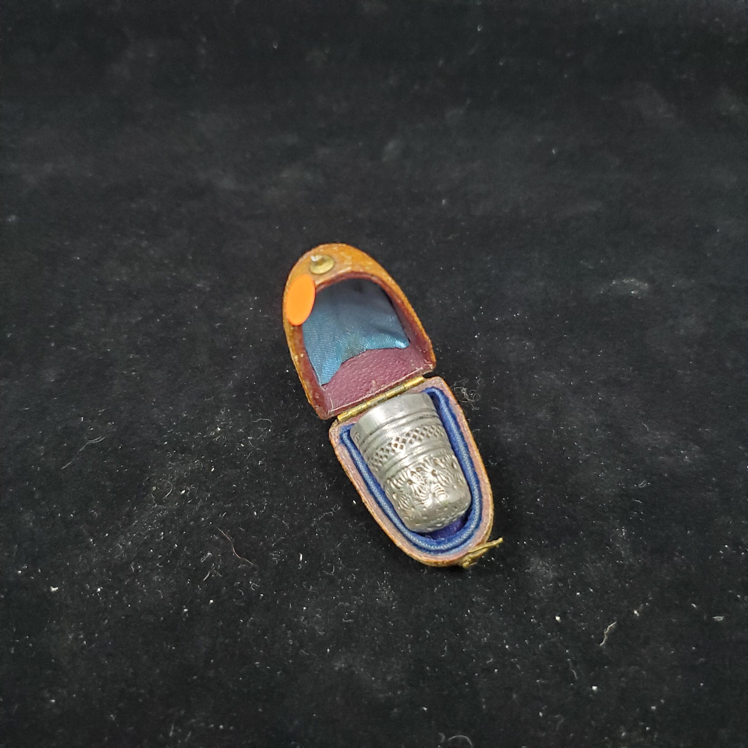 Leather thimble case with brass fittings. Thimble shaped in 2 colours of leather, light brown lower part and maroon on top. Blue velvet inside lower part, ,lighter blue satin upper part. Thimble included. Sterling silver thimble with plain band at rim. English hallmarks on band - Birmingham 1907 size 8 maker JF (James Fenton). A band of cross hatching above with 2 narrow indented lines abve and below it. Daisy pattern above to and over top. Some holes.