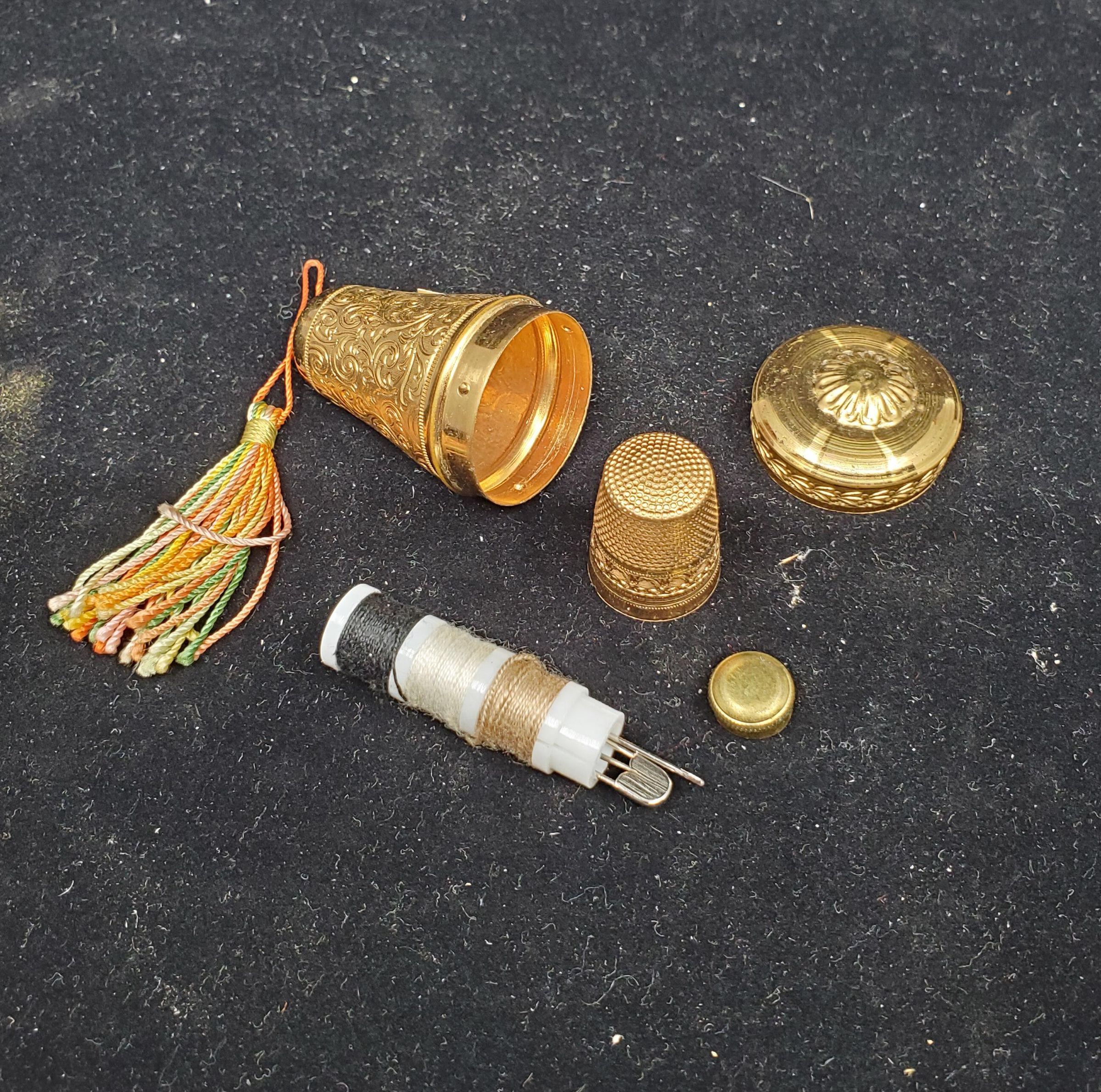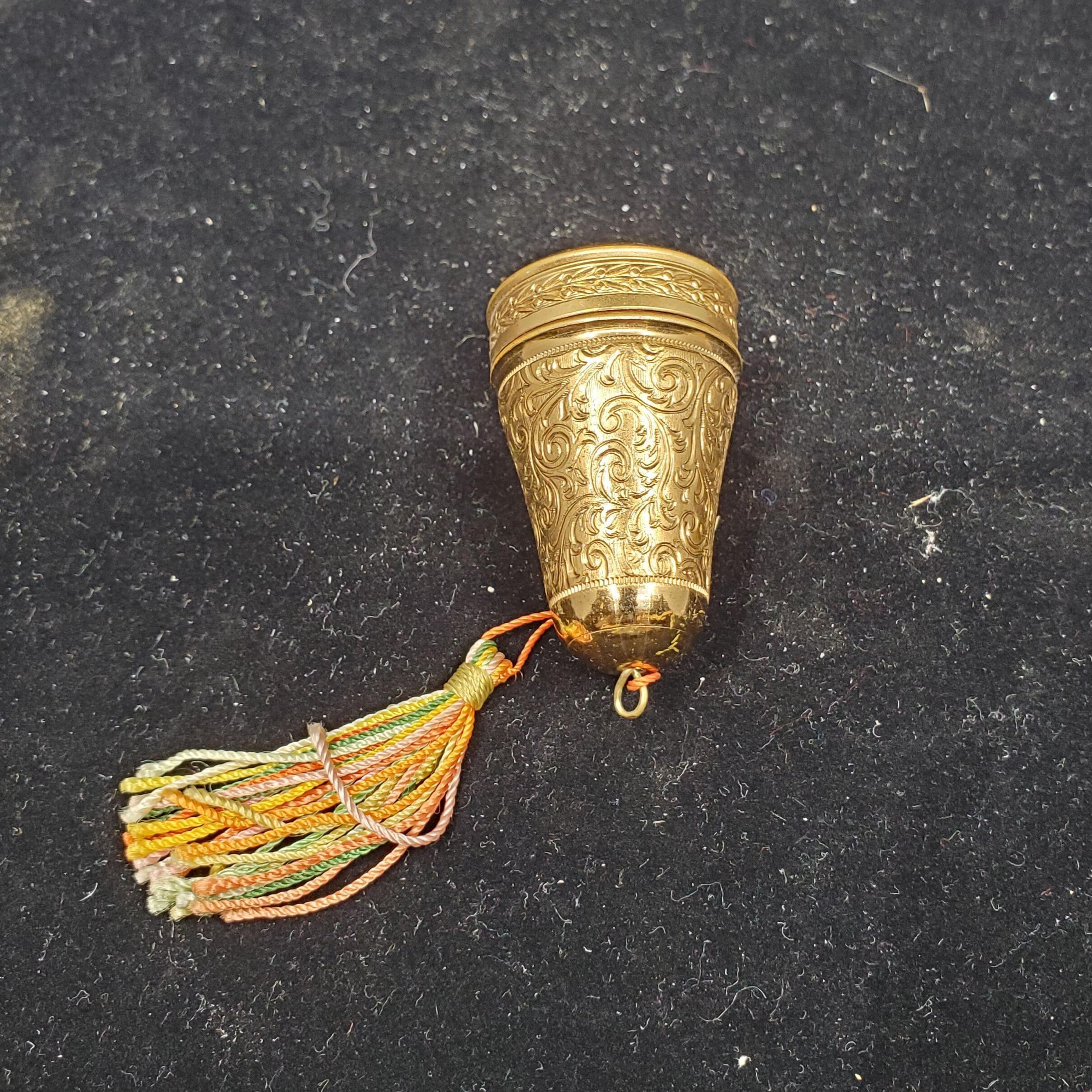 Gold coloured metal pear shaped case, with allover scroll pattern. Wide at top narrows at bottom which has multi coloured tassel. Inside thimble, white plastic 3 thread bobbin with inner needlecase and gold metal top. No marks. Gold coloured thim metal thimble with plain narroe band at rim. Wider band of pattern above, then knurling to and over top. No marks.