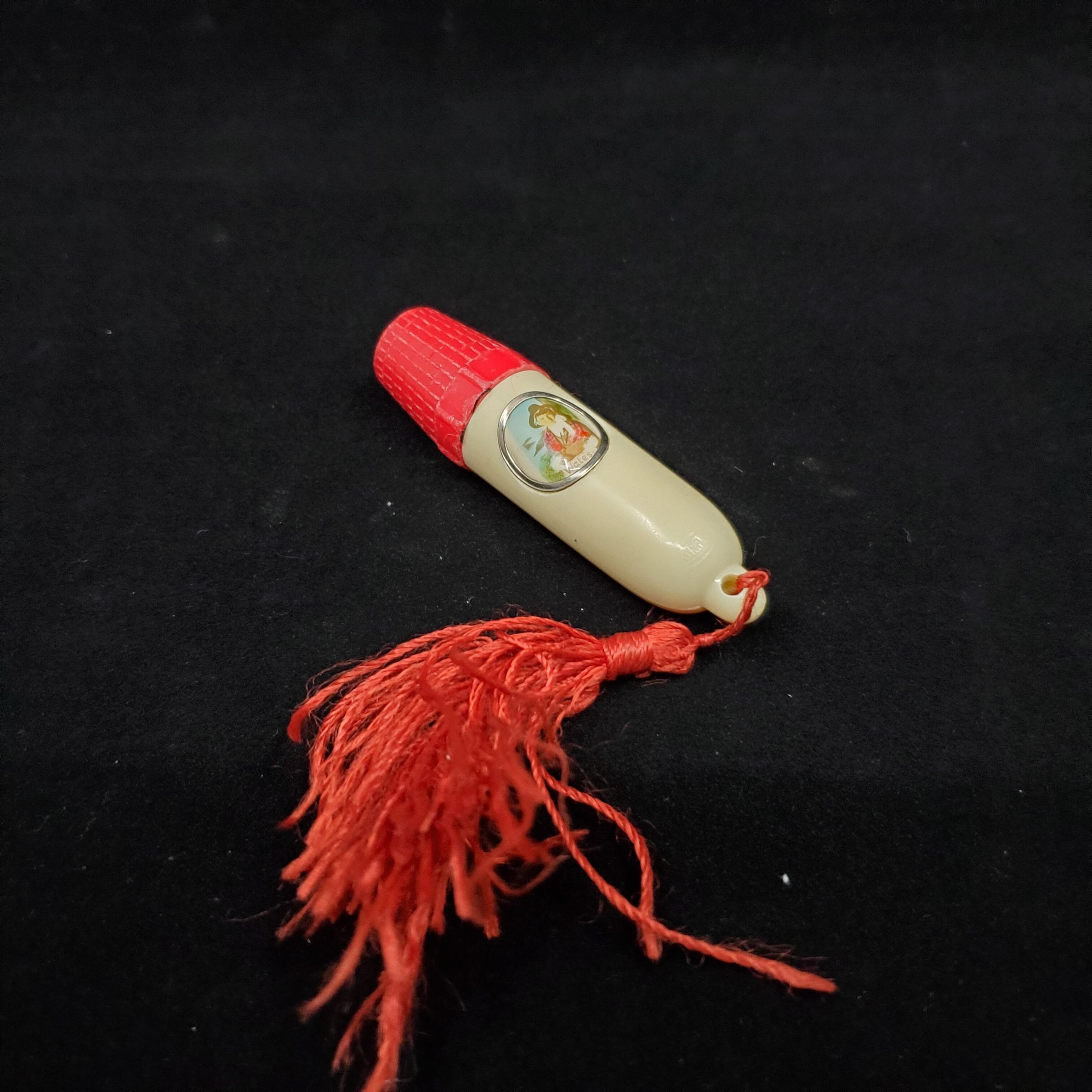 Bullet shaped sewing kit with thimble top. Red tassel other end. Cream coloured case with red thimble top.Round silver framed small picture on case of Welsh boy and word Wales . Inside green 3 thread bobbin, plastic, with white top for needle case inside.No marks. Red plastic thimble with wide plain band at rim. Band has 8 vertical lines dividing it into section.Waffle knurling from band to top Round knurling on top. No marks.