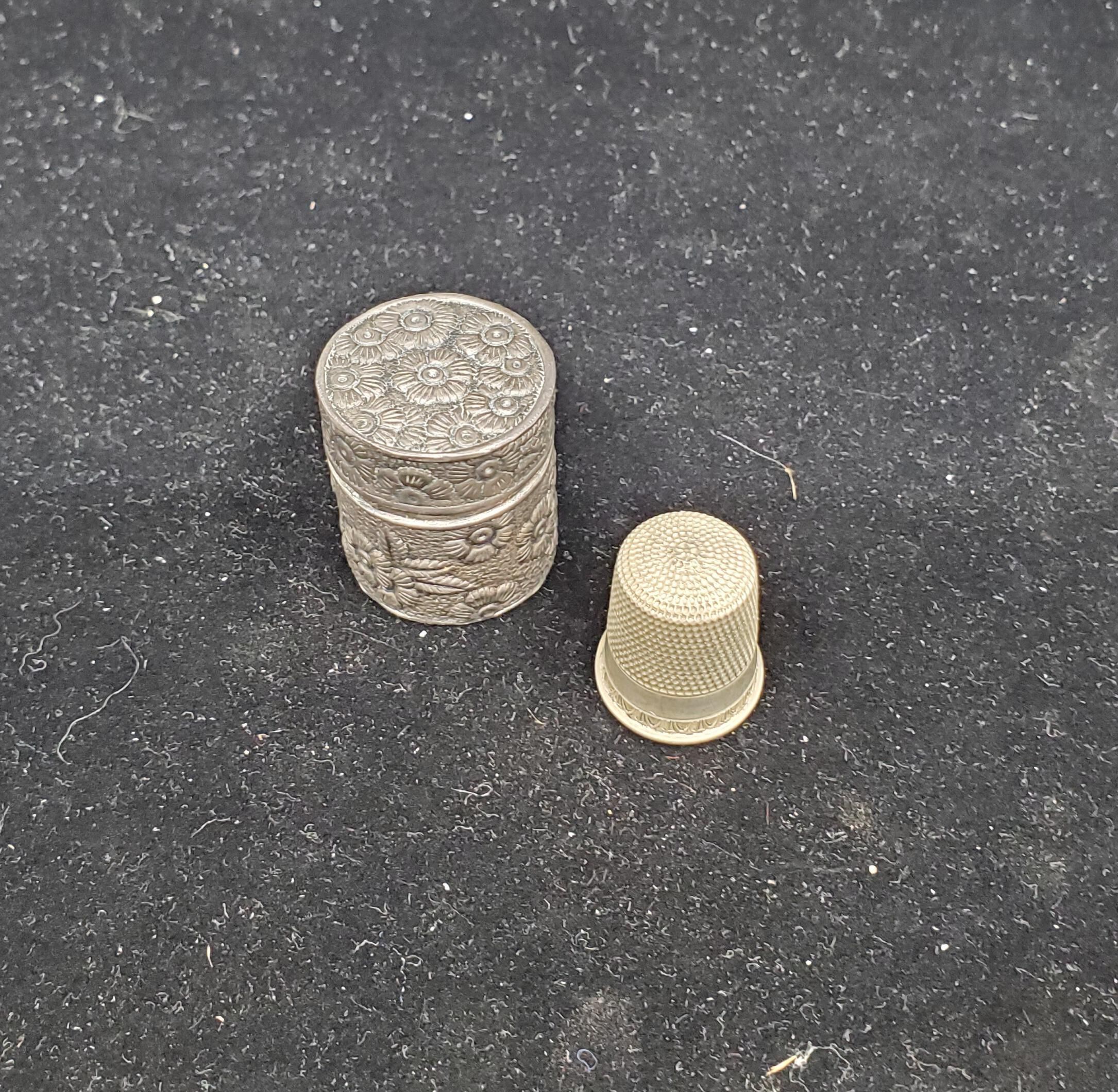 Silver thimble case,side seamed. All-over raised flower design on a pounded background. Stamped 925 on bottom. No thimble as [purchased. Thimble added. Sterling silver with rolled rim. Narrow band of pattern - egg & dart above rim. Narrow plain band above with size - 11 - stamped on it. Knurling to & over top.Inside apex Simon Bros. logo with Sterling Silver U.S.A..
