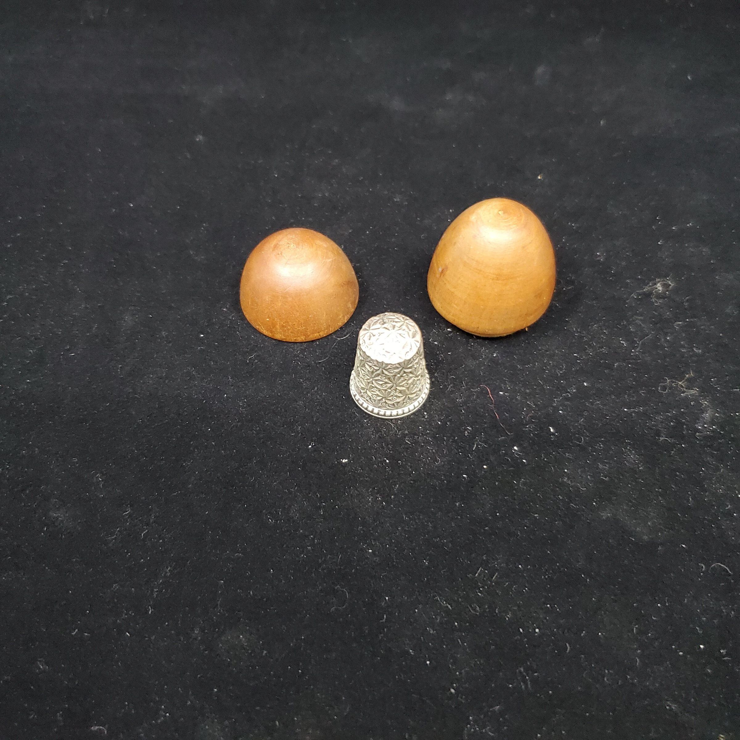 Egg shaped light brown wooden case - probably walnut. Pull off top. Nicely marked. Thimble - Silver thimble with band of raised dots at rim. Slightly rounded top. All over pattern of leaves and daisy like flowers with small circles and radiating lines. Inside top the Ketcham and McDougal logo , 8 (size) and Sterling.