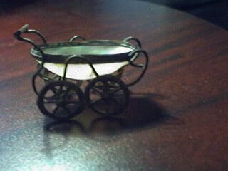 Case - Case in form of baby carriage. Mother of Pearl half shell with brass rim, brass wheels and handle. No marks. Thimble - None