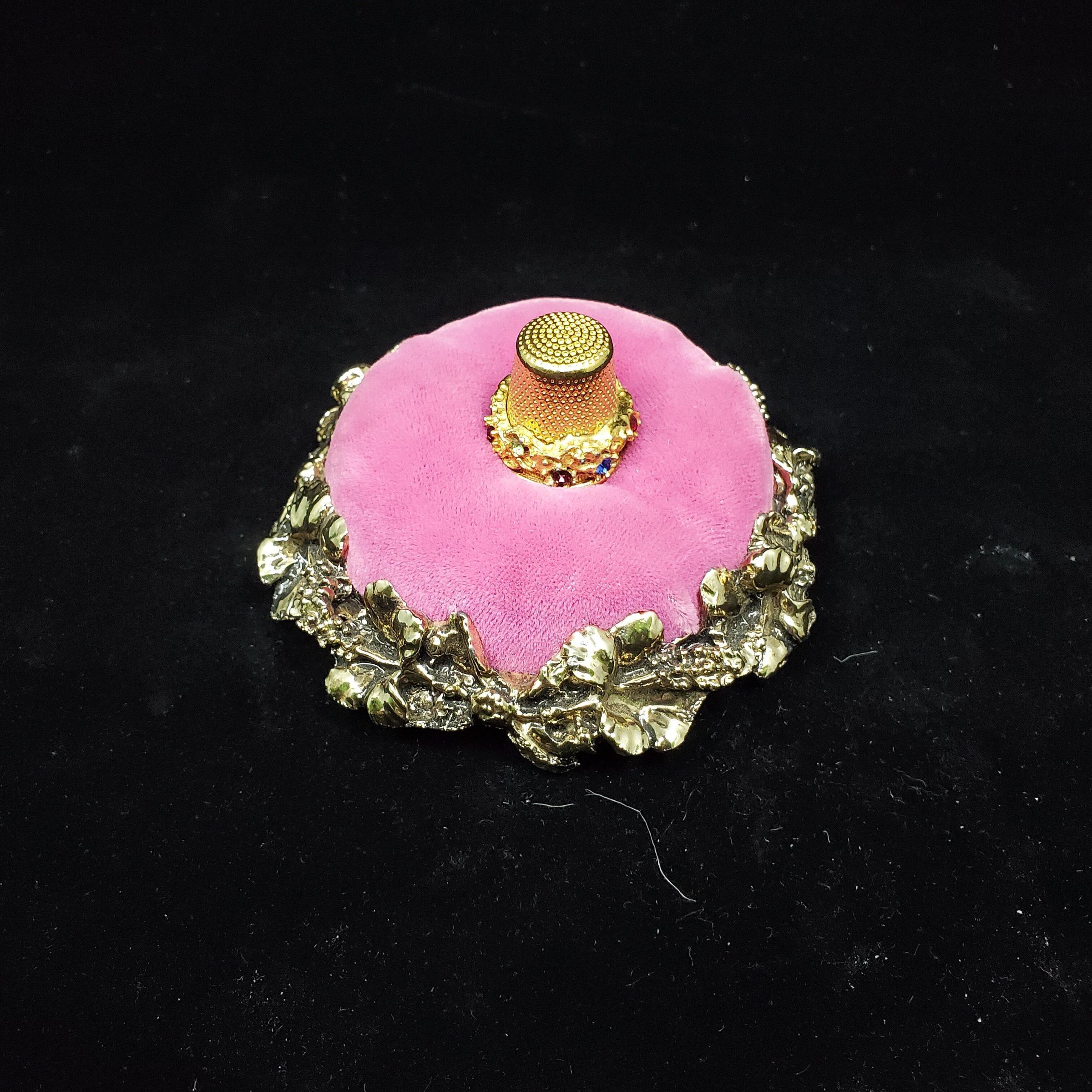 Brass pincushion with thimble on top.M odern brass or gold coloured flowers with stamens around edge and flat open metal work on bottom. Holding a cerise coloured pincushion with knob in center holding thimble.4 short legs.No marks. Thimble - Thimble gold coloured metal with rolled rim. Wide band of applied coloured - red, green, blue, purple, glass stones around encased in gold coloured metal band. Knurling from band to and over top. No marks.